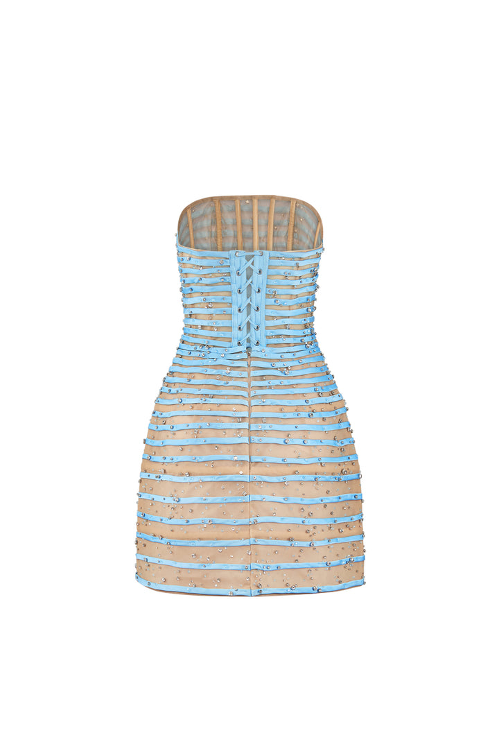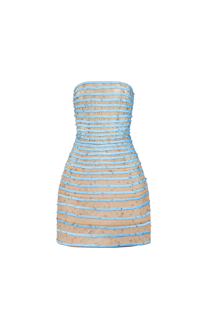 This mini dress features a straight-across neckline and delicate chiffon fabric adorned with horizontal striped lines. Attached beads add subtle texture and elegance, making it a refined choice for stylish occasions. The lightweight chiffon ensures comfortable wear while the A-line silhouette flatters a variety of body shapes.