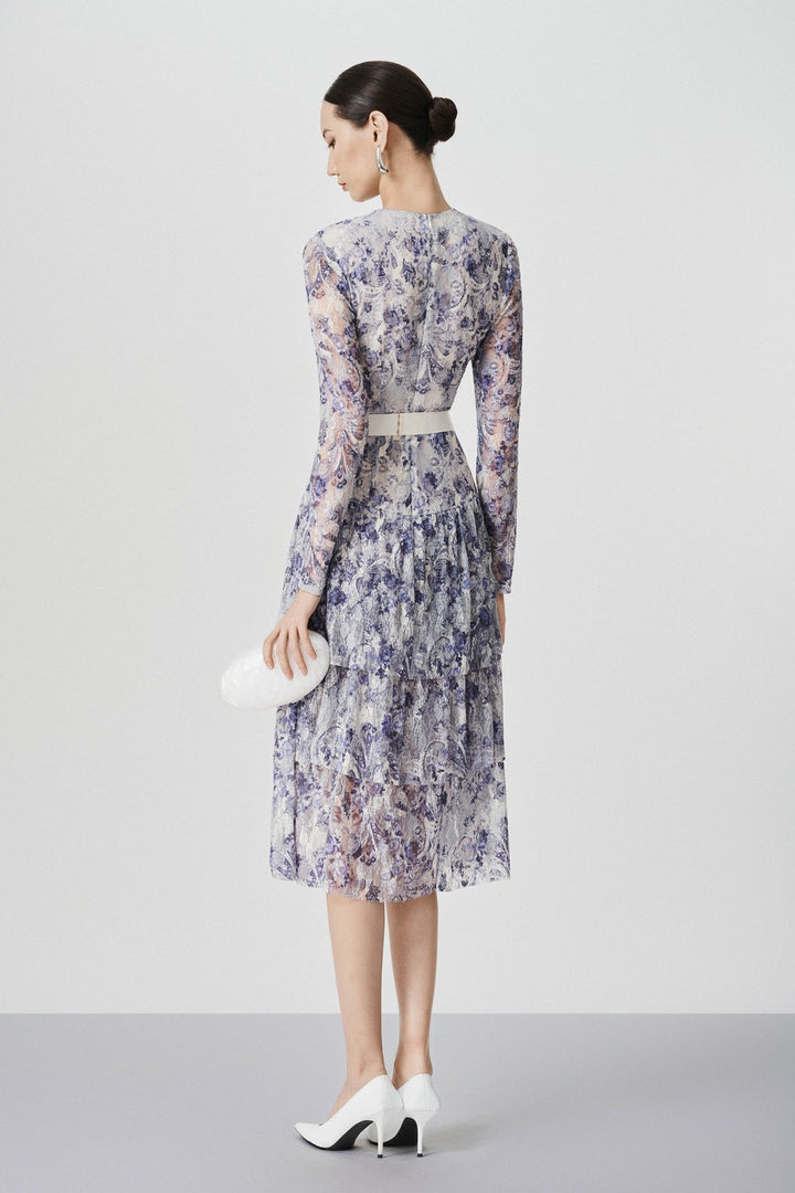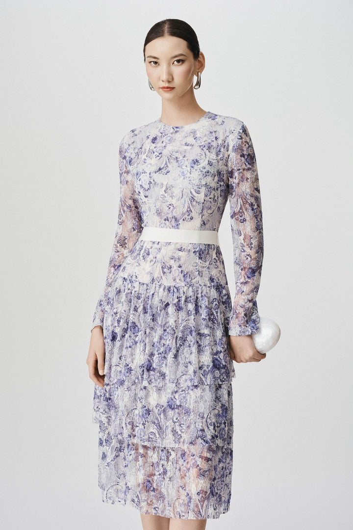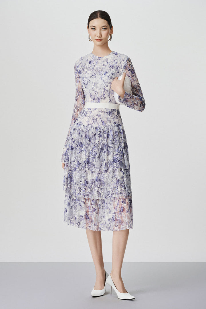 This midi dress features a layered skirt, adding depth and texture to your outfit. Sheer lace sleeves give a delicate touch, while the round neck creates a classic silhouette. Elevate your wardrobe with the sophisticated style of the dress.