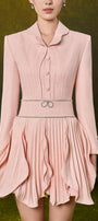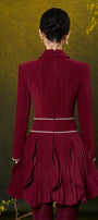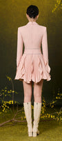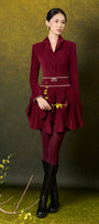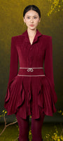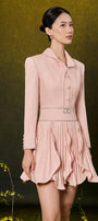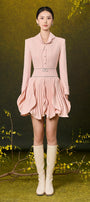 Ambrosia petal-shaped ruffled skirt, Attached beads on waistband and cuffs, Color-matched buttons, Slight curved collar, Button row on cuffs, Two layers design
