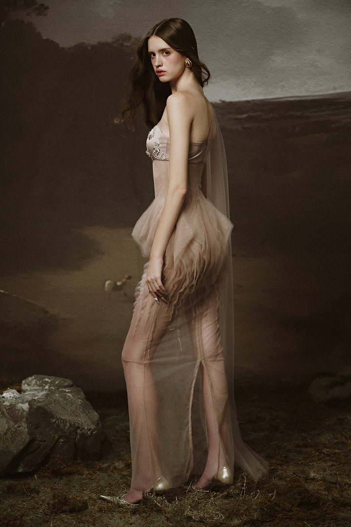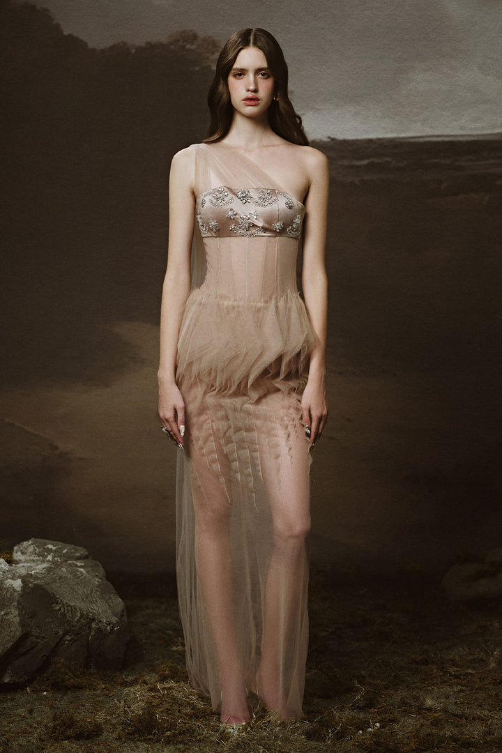 | Special Features | One-shoulder design, Crystal embellishments on the chest, Flattering tulle hip, See-through skirt |