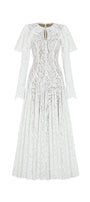 The ruffle sleeves and ankle length add a touch of elegance, while the A-line silhouette flatters all body types. Made with delicate lace, this dress is perfect for any special occasion. Experience the perfect blend of sophistication and charm.