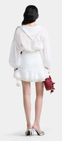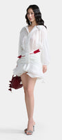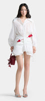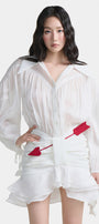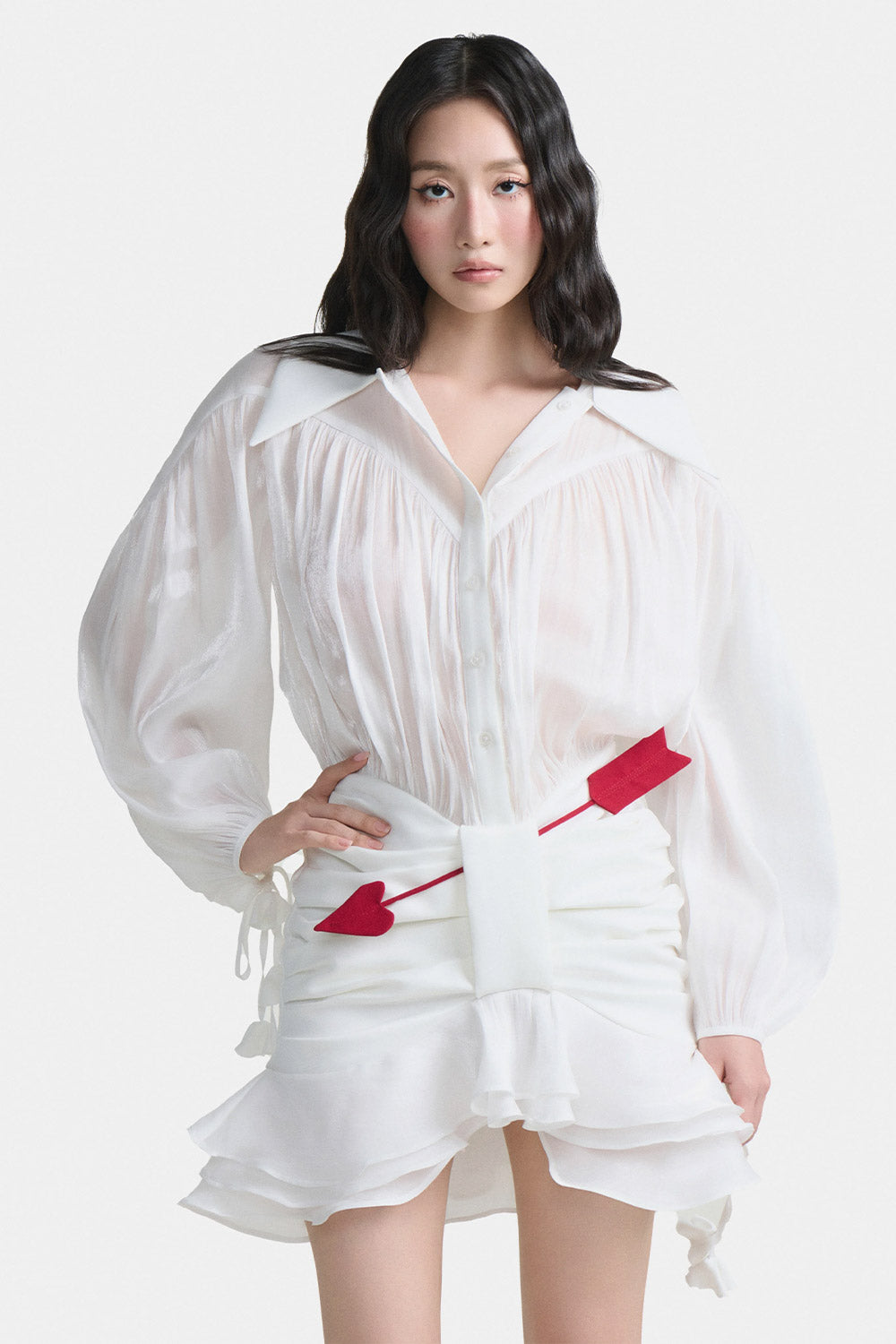 Pointed shirt collar, Draped hip detail, Fabric arrow embellishment, Label attached at the back of the collar, Sleeves with fabric floral ties