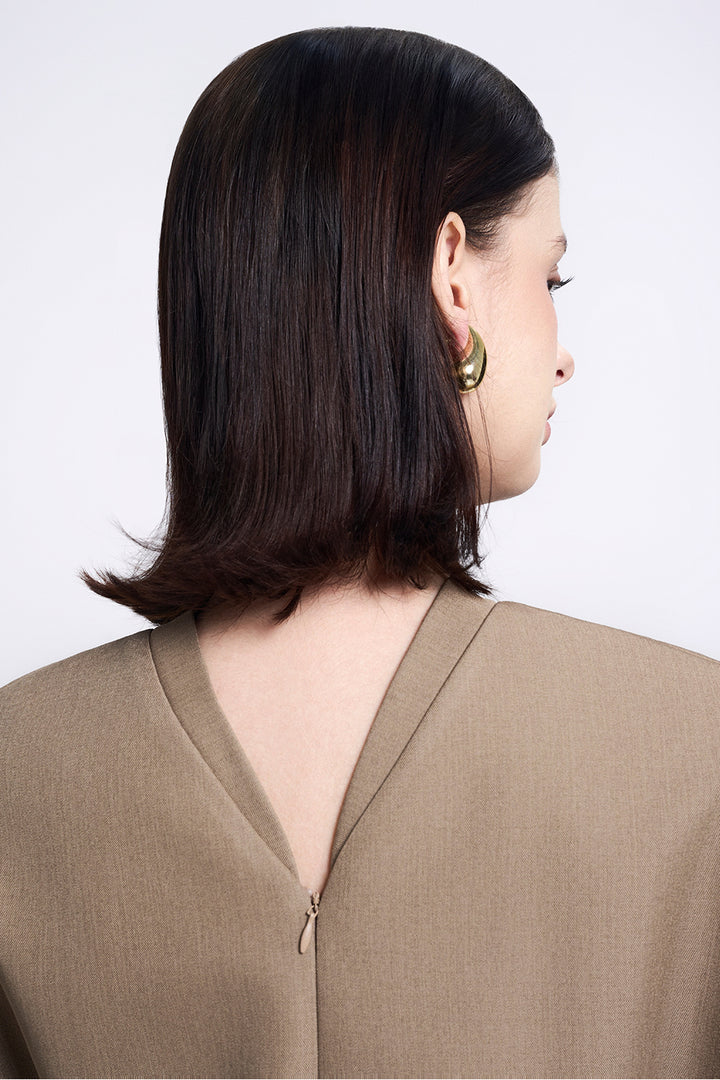 The top features elegantly wide sleeves and a refined mock neck, offering a sophisticated silhouette that balances comfort and style. Crafted from durable twill fabric, this top provides structure while maintaining ease of movement, making it ideal for both professional and casual settings. Its clean lines and thoughtful design ensure a polished look with effortless wearability.