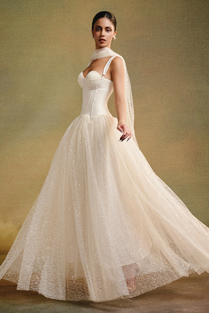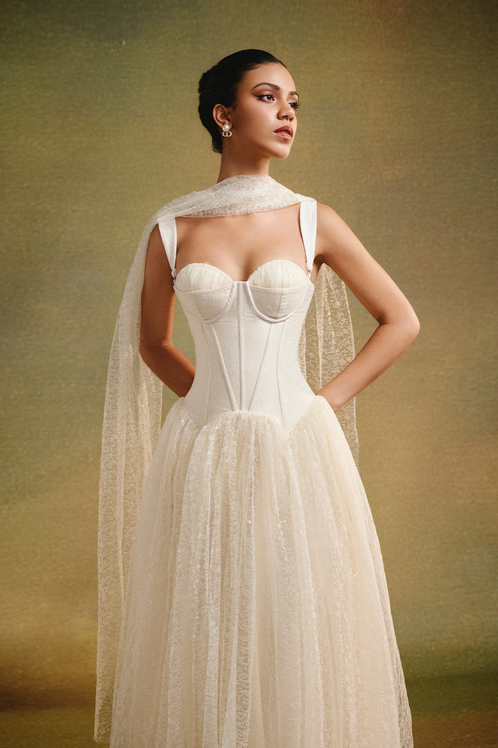 Expertly crafted from delicate lace, this A-line maxi dress features a refined sweetheart neckline and elegant gathering detail. Its timeless design makes it a sophisticated choice for weddings, formal events, or evening soirées.