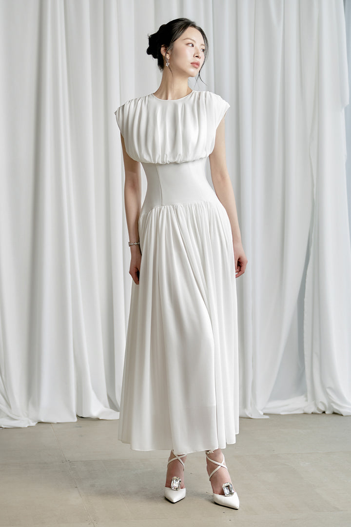 This dress features a flattering corset waist that sculpts the silhouette, paired with a delicate chiffon fabric draped elegantly across the chest. Its midi length and structured design offer a sophisticated balance of comfort and style, making it an ideal choice for formal occasions or refined everyday wear.