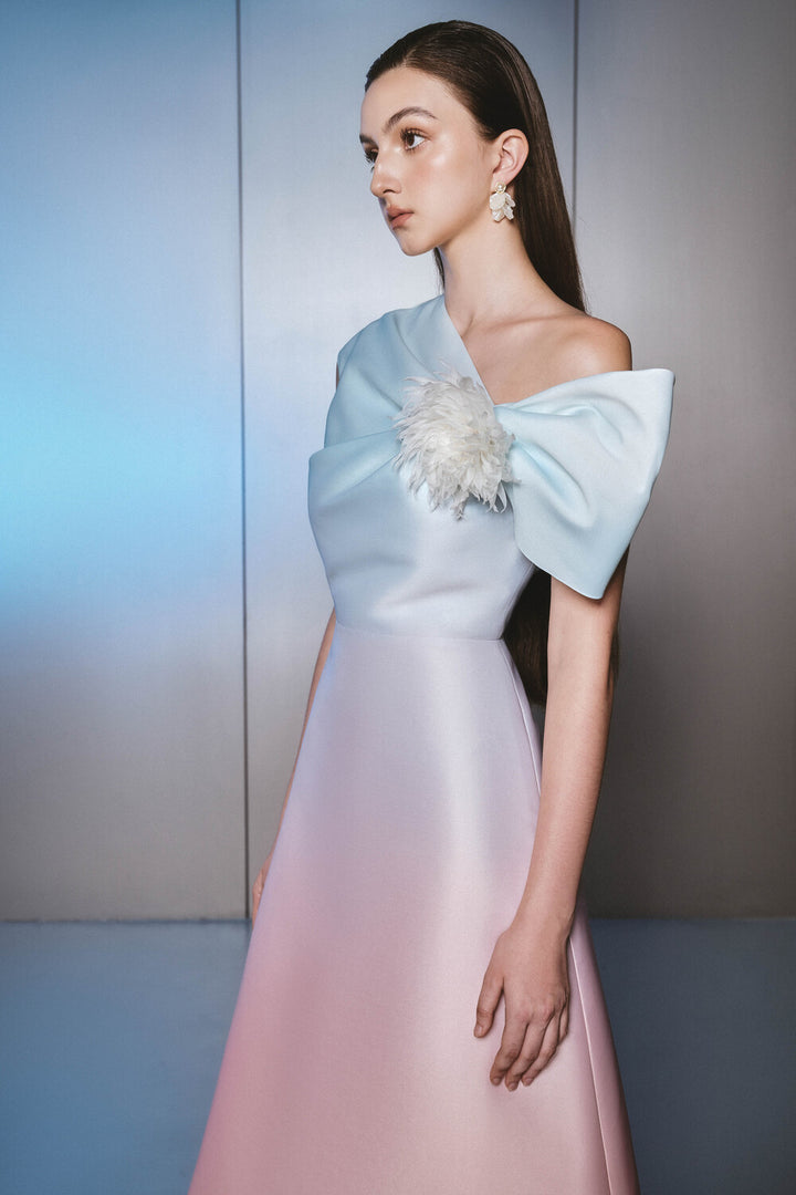| Special Features | Asymmetric shoulder with bow on the side, Dart lines, Ombre transition pink and blue |
