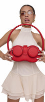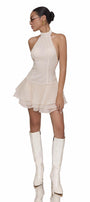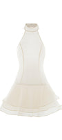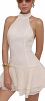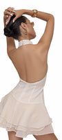 Draped layers bottom, Open back, Back zipper, Halter neck with button at the back