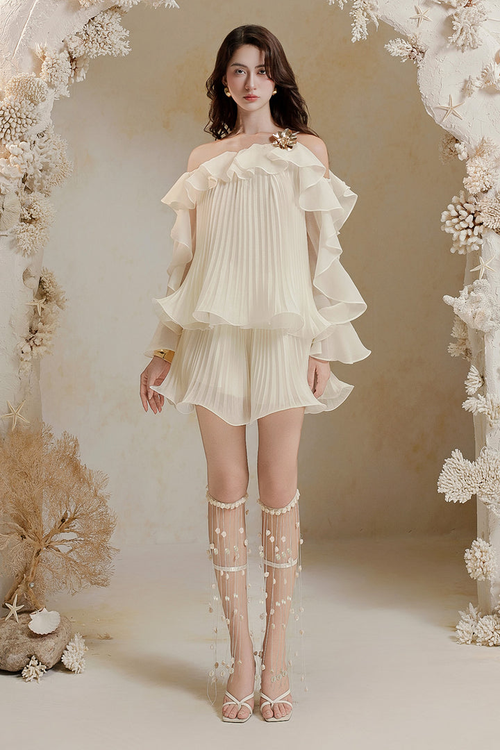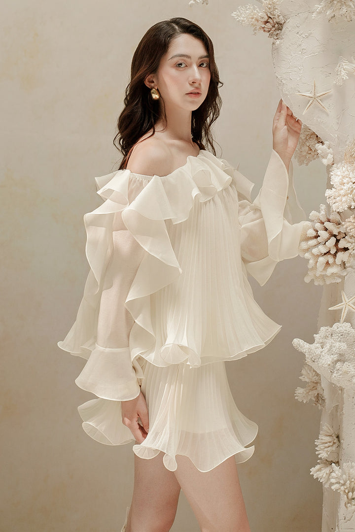 The top features an elegant off-shoulder design paired with a delicately pleated bodice, creating a refined silhouette. Crafted from lightweight organza, this top offers a subtle sheen and structured shape, while the blouson fit and ruffle trim add a sophisticated, feminine touch. Ideal for elevating both casual and formal ensembles with expert styling versatility.
