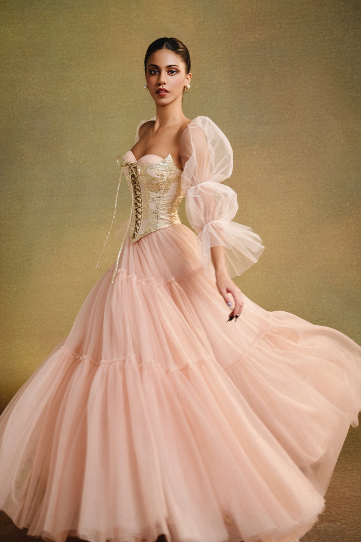 Elevate your style with our expert-crafted A-line maxi dress, featuring a romantic sweetheart neckline, elegant puff sleeves, and delicate gathering on soft tulle. Perfect for weddings, evening parties, and special celebrations.