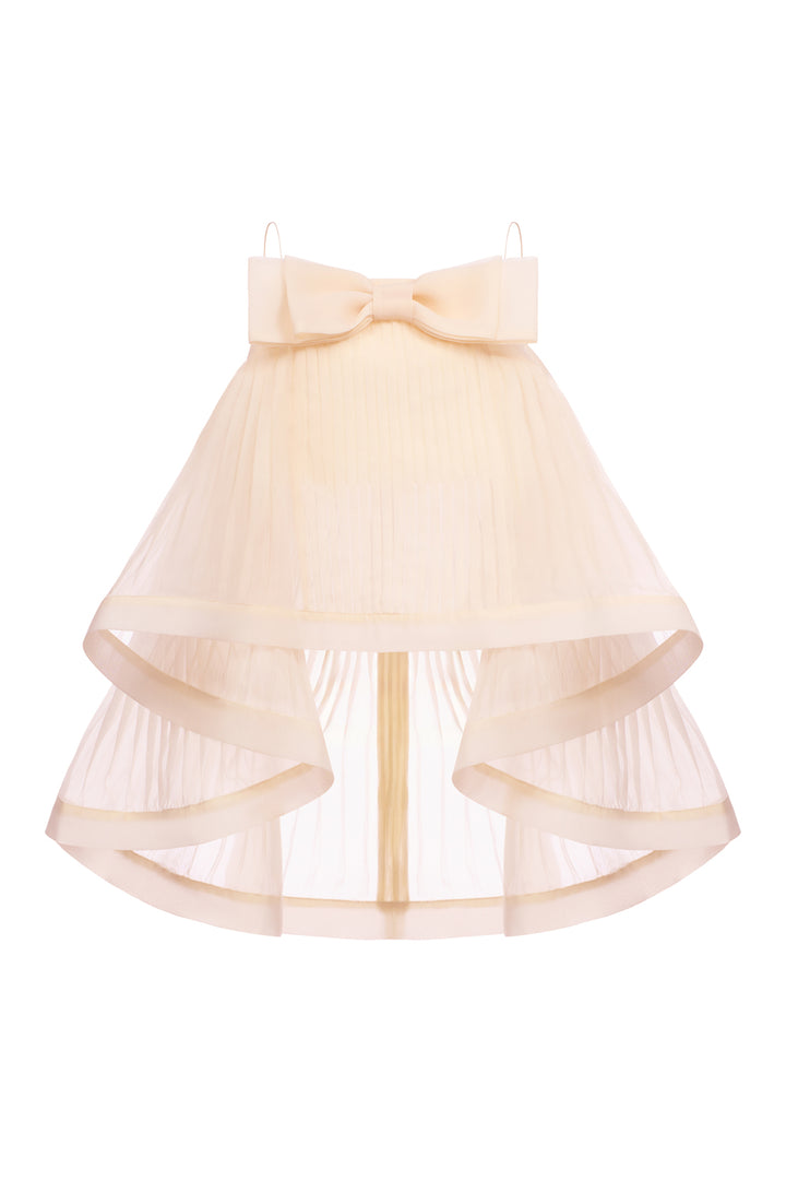 | Special Features | Fixed camisole straps, Attached bow on the chest, Half-lined at the bust area, Front bodice with fine pleats, plain back, Hemline structured with inner wire for natural vol |