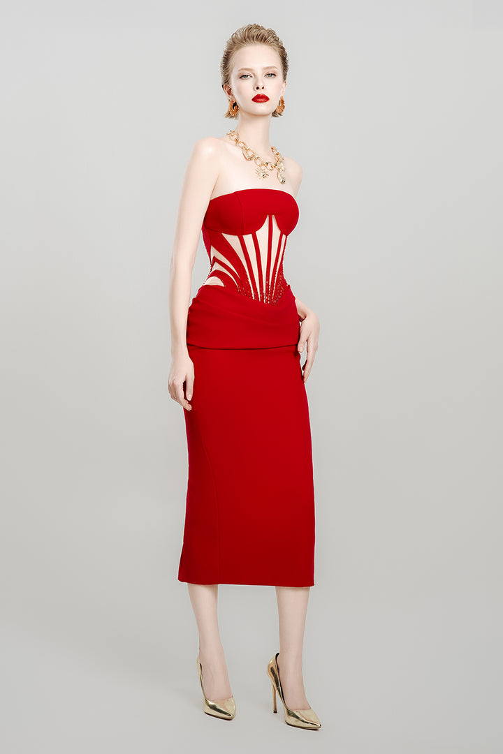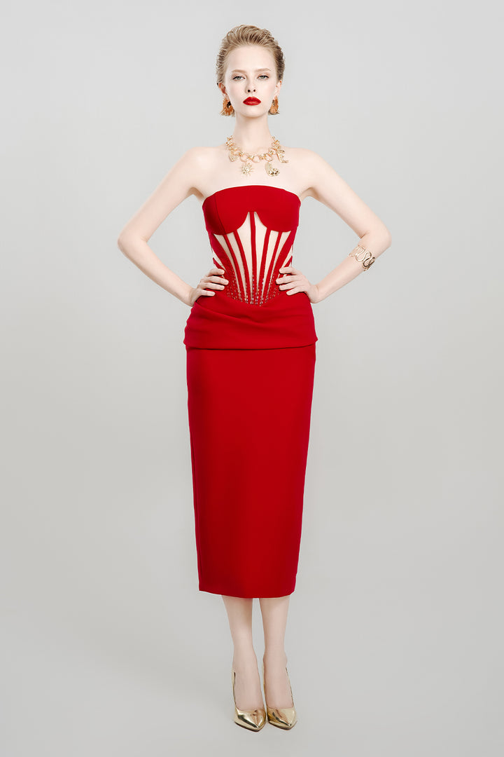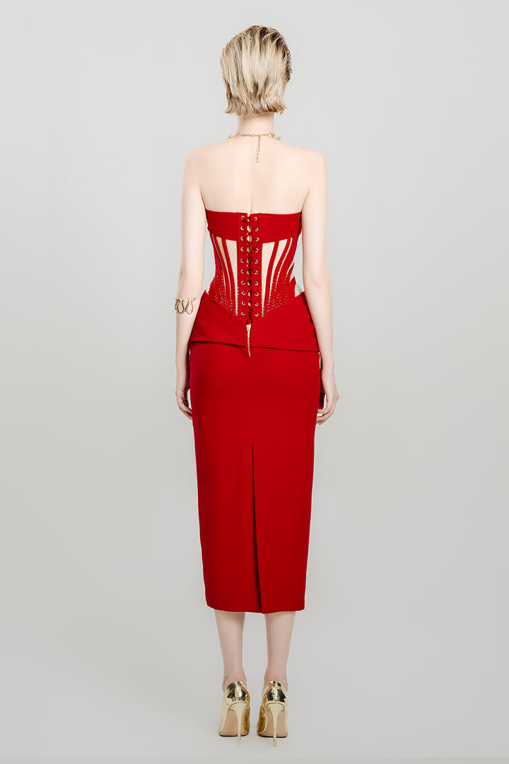 The dress combines structured elegance with flattering design. Crafted from smooth crepe fabric, this midi dress features a pegged silhouette that contours the hips, enhanced by a corset waist that defines and sculpts the figure. Its rich scarlet hue adds a bold touch, making it perfect for formal events or sophisticated evenings. Expertly tailored, this dress delivers a confident and polished look with timeless appeal.