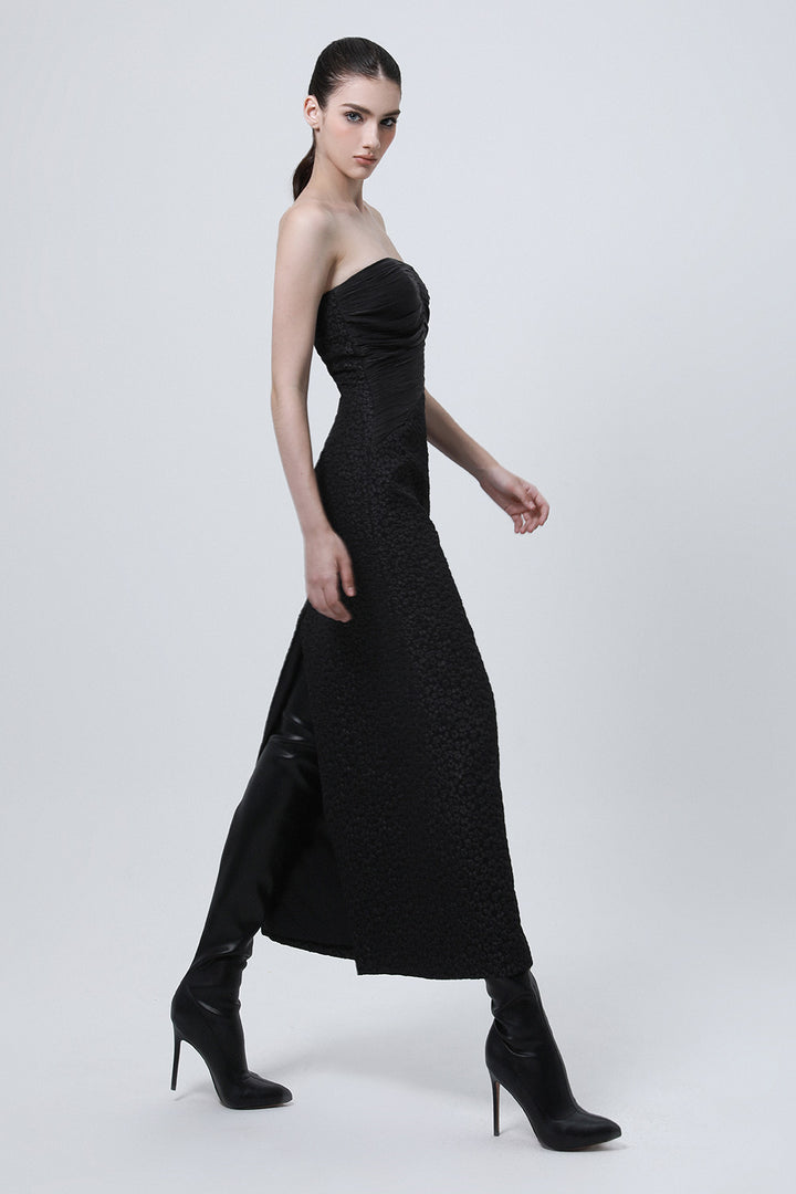 Sire Strapless Gathered Brocade Silk Midi Dress