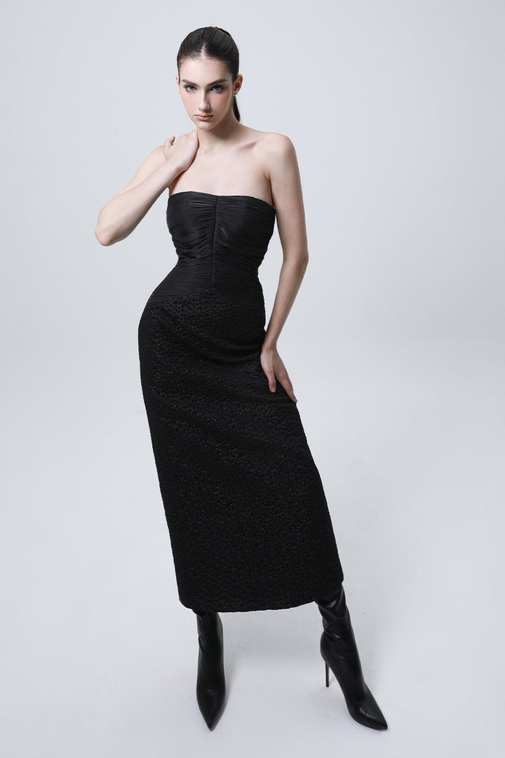 Expertly crafted from luxurious brocade silk, the dress boasts a timeless elegance. The strapless design paired with a gathered waist creates a flattering silhouette for any body type. Step into any event with confidence and style in this stunning midi dress.