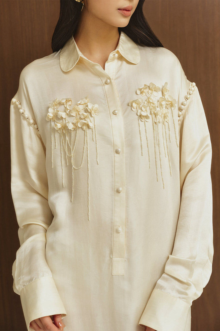 | Special Features | Slits on the side, 3D floral applique with beads on the chest, Covered matching color button, Split sleeves with knot and button line, Slit cuff with button line |