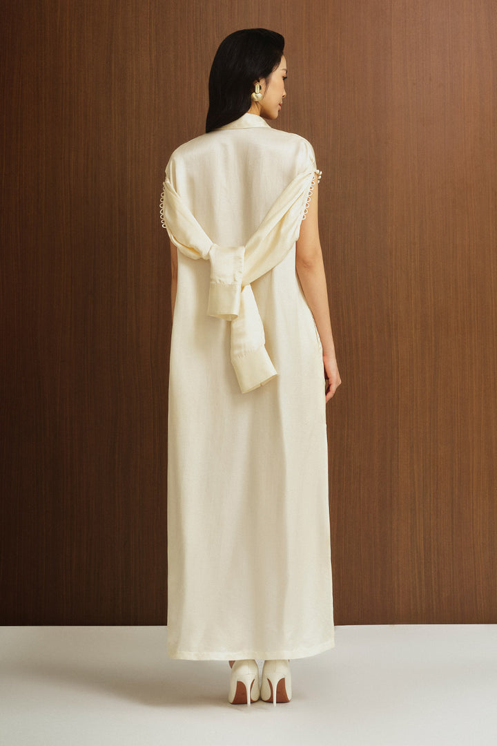 Expertly crafted from luxurious silk, the dress exudes elegance and sophistication. The sleek straight sleeves and ankle-length design provide a modern and flattering silhouette, making it a perfect choice for formal occasions. Elevate your wardrobe with this timeless and stylish dress.