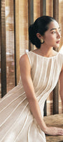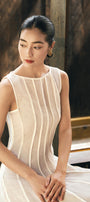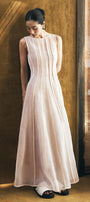 Crafted with an A-line silhouette and ribbed organza fabric, this dress exudes a timeless elegance. The flattering design elongates the figure while the intricate ribbed detailing adds texture and dimension. Perfect for special occasions or elevated everyday wear, this dress offers both style and comfort.