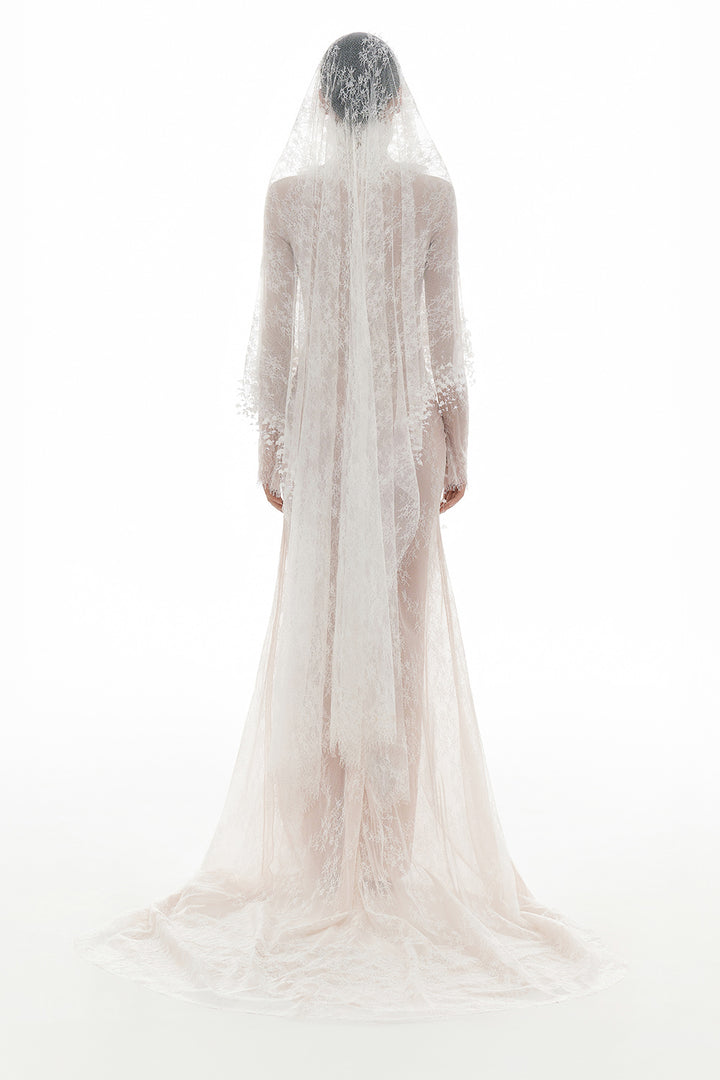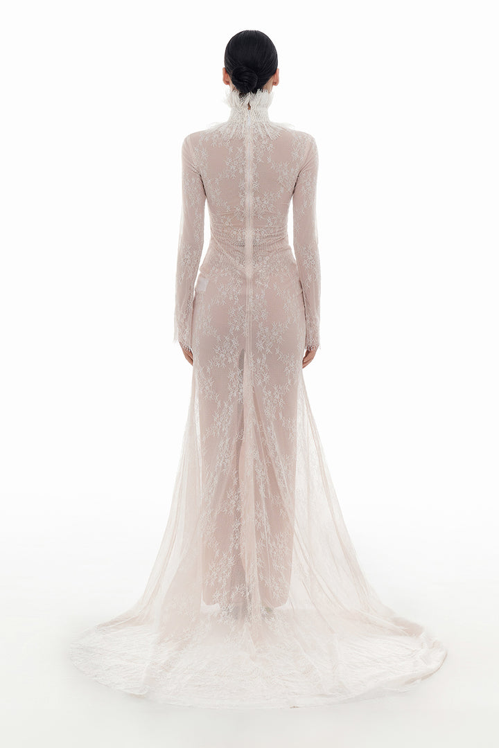 Special Features Trumpet see-through mesh lace covered skirt, Gathered elastic high neck, Lace trimming, Sheer effect