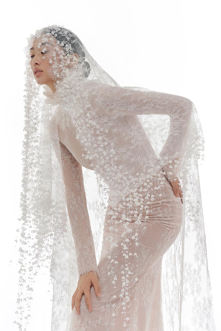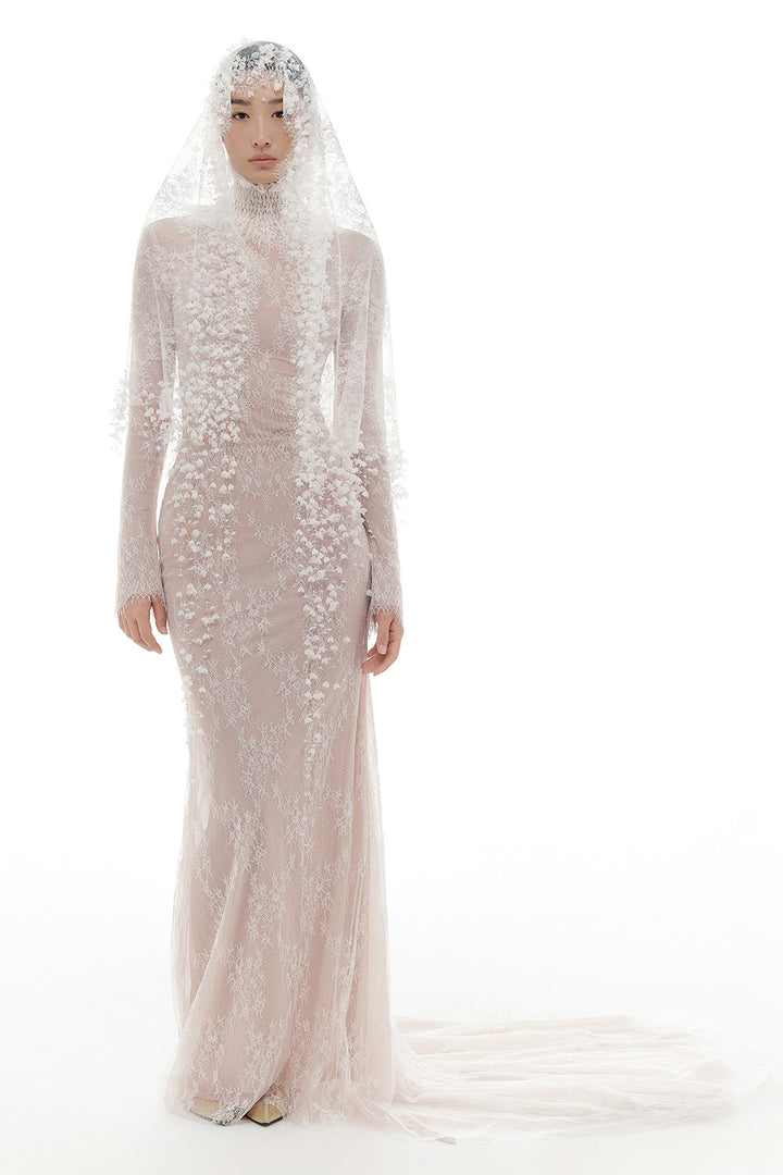 This dress features a trumpet silhouette and a high neckline, providing a stylish and elegant look for any occasion. The delicate floral lace adds a touch of femininity to this dress, making it a perfect choice for a romantic evening out or a special event. With its comfortable fit and classic design, this dress is a must-have for any fashion-forward individual.
