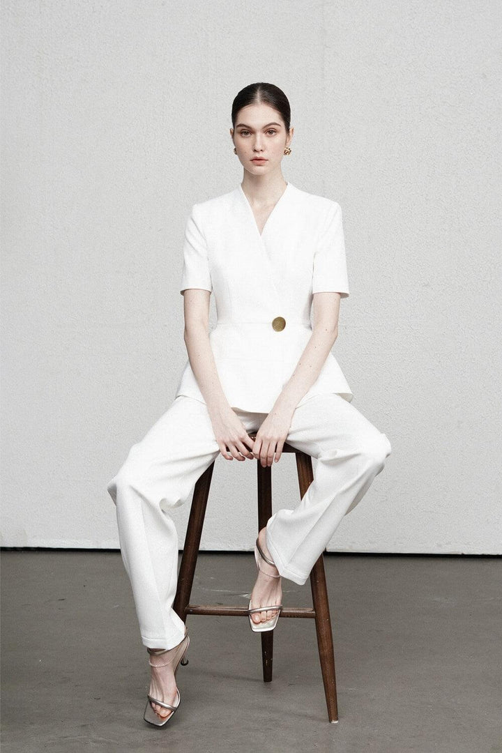 Designed with a basic V-neck on a high-quality material background, the shirt further exalts the elegance and nobility of modern women. A peplum design created a light flare effect that is extremely feminity and helps to flatter her charming hip