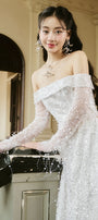 Special Features: Attached beads and sequins entire the body, High side slit, Open shoulder