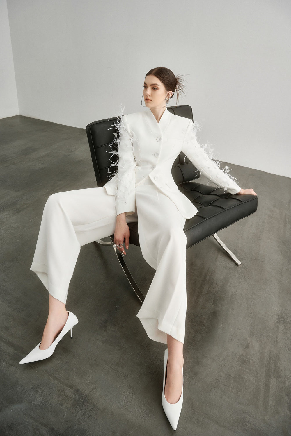 Made from a soft cotton blend fabric, this blazer is both stylish and comfortable. The feather detailing adds a touch of elegance, perfect for any business or formal occasion. Elevate your look with this luxurious and versatile blazer.