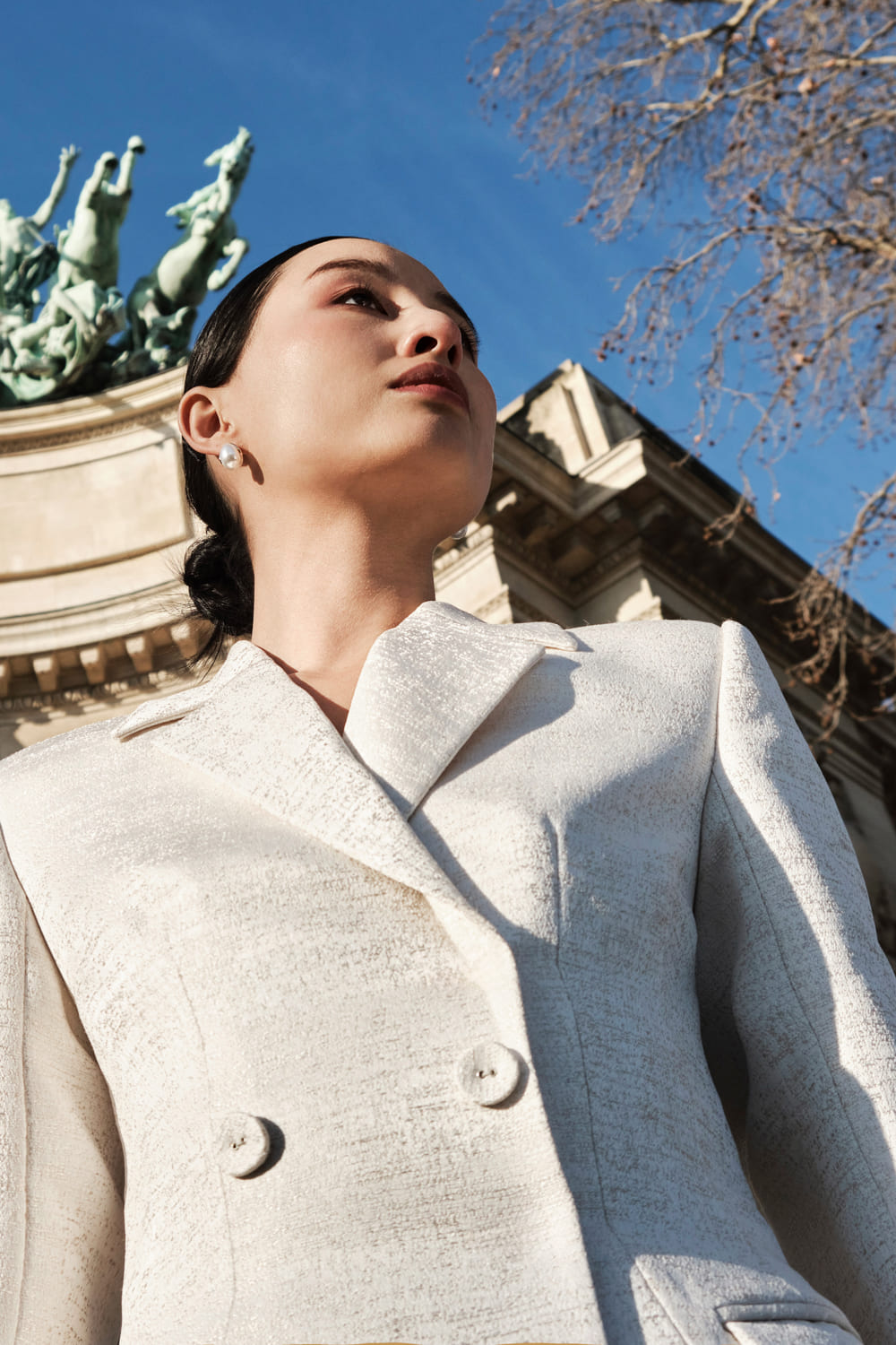 Notch lapel, Dart lines, Double-breasted, Flap pockets on the waist