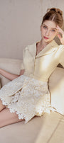 Sharp lapel, Sleek buttoned front, Lace-adorned peplum part