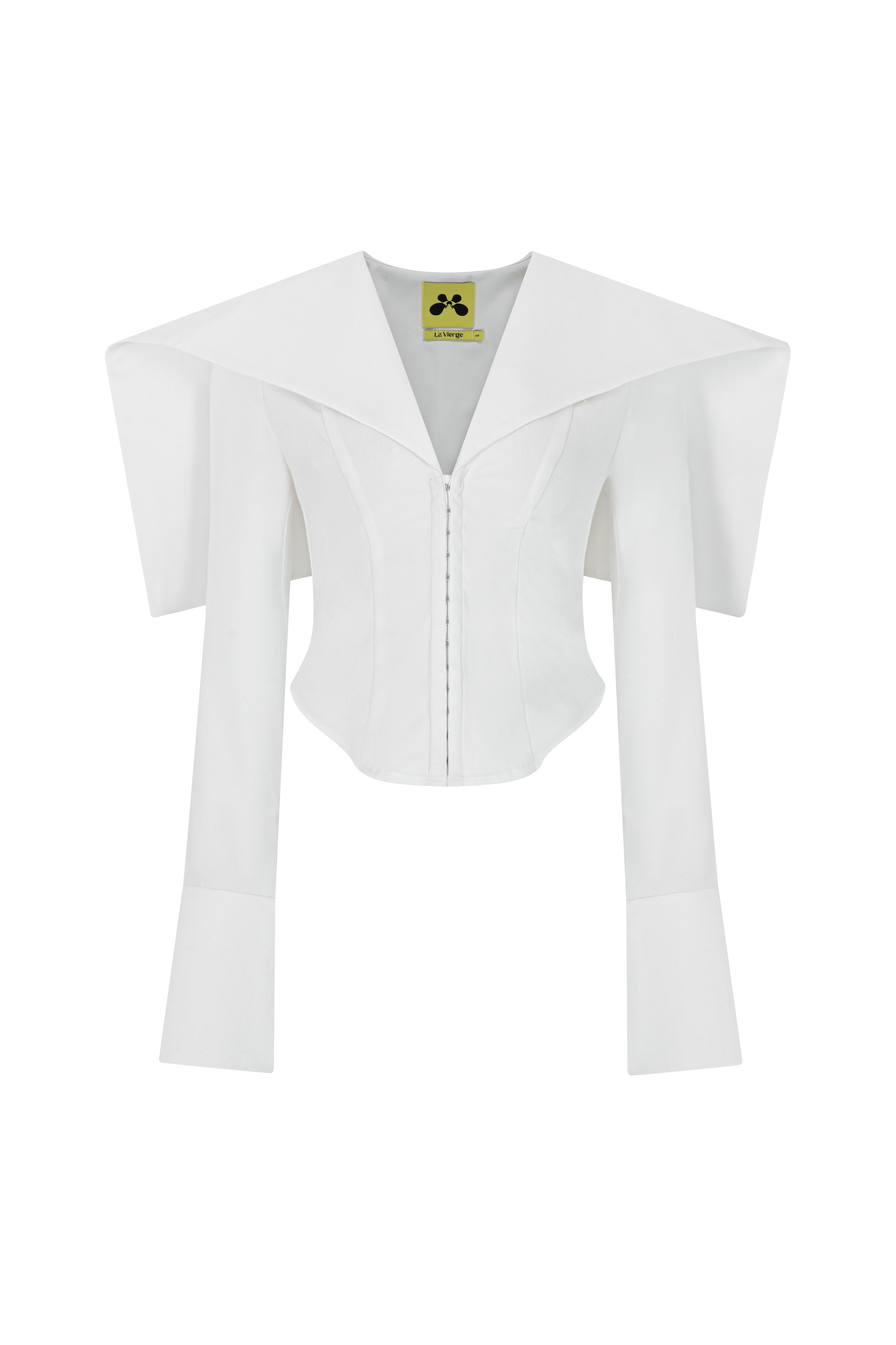 The jacket combines a sleek, form-fitting silhouette with a dramatic cape shoulder design for a striking, modern look. Crafted from durable twill fabric, it offers structured support while maintaining comfort. This jacket is an expert choice for elevating any ensemble with a bold yet refined statement piece.