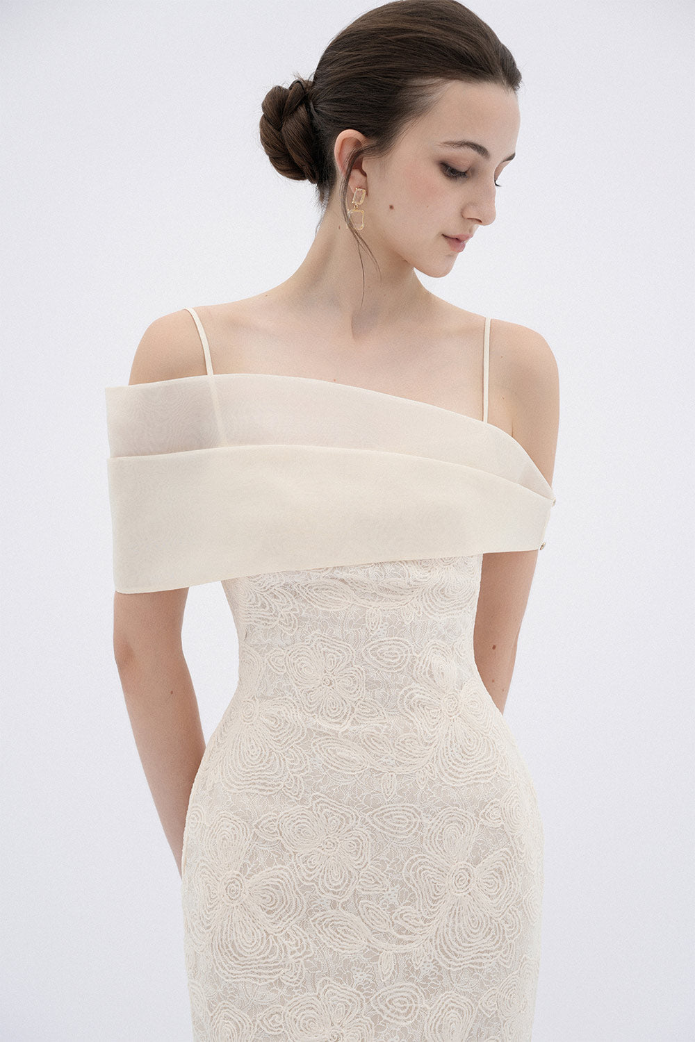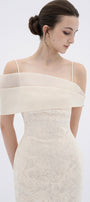 Experience elegance and sophistication in our dress. The sheath silhouette flatters your curves, while the cold shoulder design adds a touch of allure. Made with delicate lace, this dress exudes femininity and grace. Perfect for a formal event or a romantic evening out.