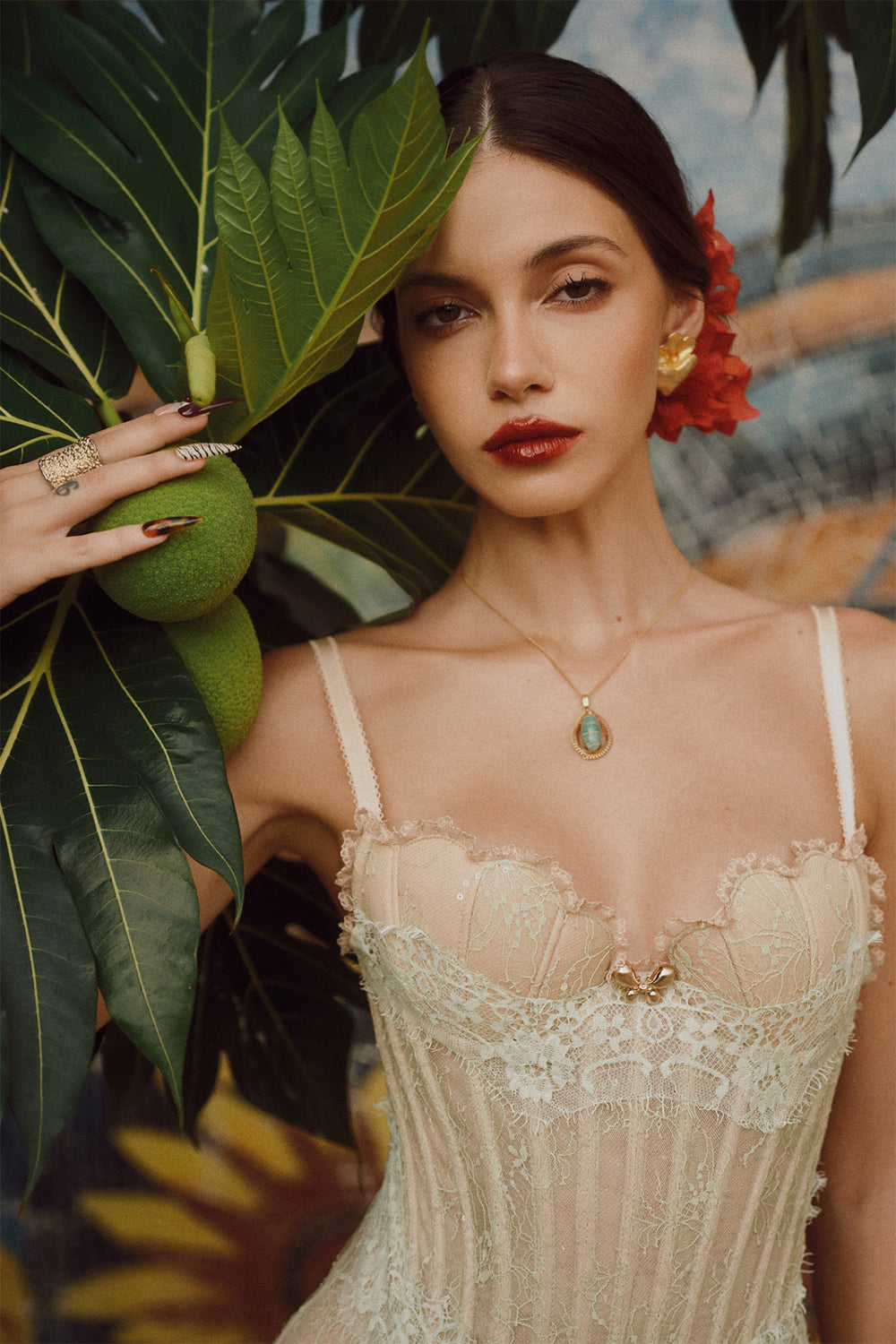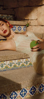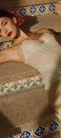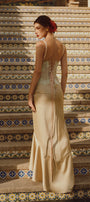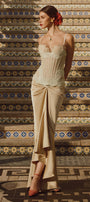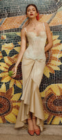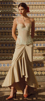 The dress expertly combines structure and fluidity with its fitted corset bodice and flowing sarong-style skirt. Crafted from luxurious silk and delicate lace, this dress offers both support and elegance. Its design accentuates the waist while providing graceful movement, making it an ideal choice for sophisticated events requiring refined style and expert craftsmanship.