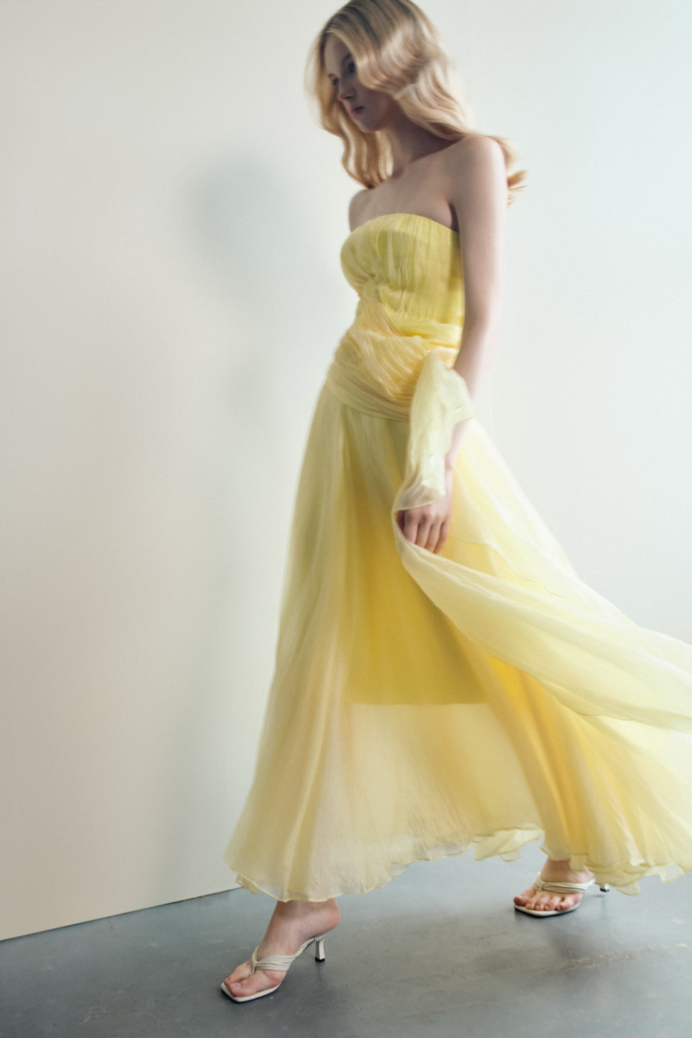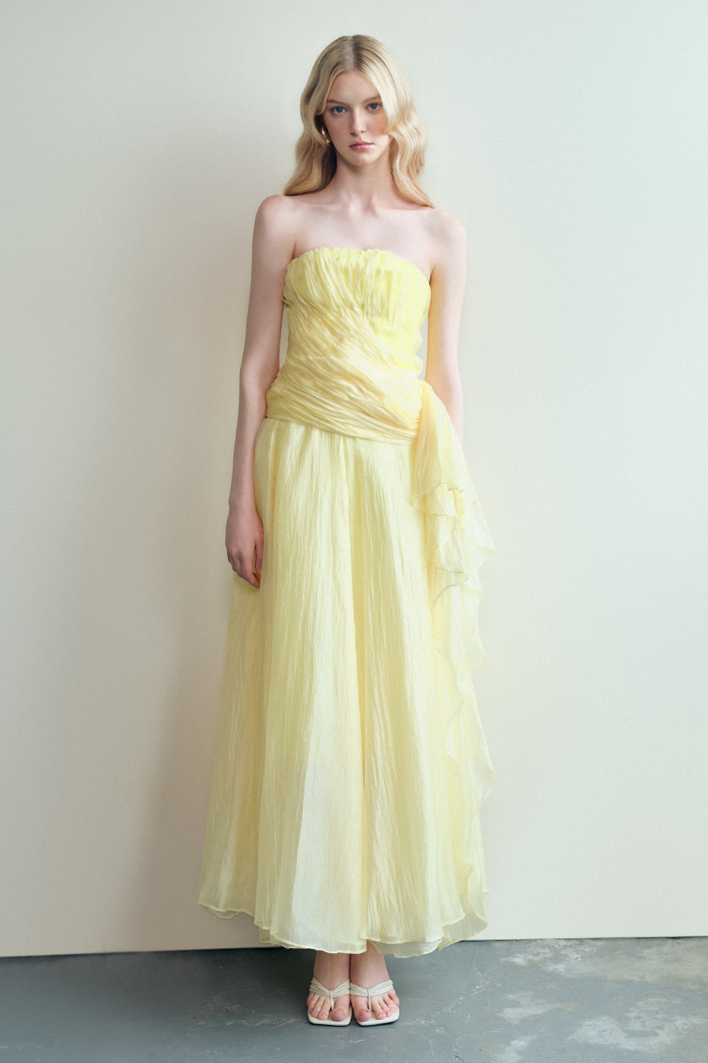 The set features a distinctive asymmetric design with an extended flap on the side, adding a modern architectural element to its silhouette. The gathered bodice, layered skirt enhances the fit and texture, creating a refined and elegant look. Crafted from delicate organza, this set offers a lightweight, airy feel perfect for sophisticated styling. Ideal for those seeking a statement piece that balances structure with softness.