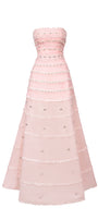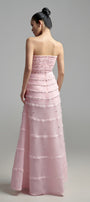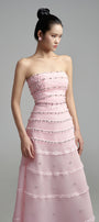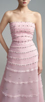 This feminine strapless maxi dress features a flowing straight silhouette that gracefully flares toward the hem. Adorned with meticulous embellishments cascading evenly from the bodice to the skirt’s edge, the design exudes effortless elegance. A versatile piece, it is perfectly suited for a variety of upscale and sophisticated events.