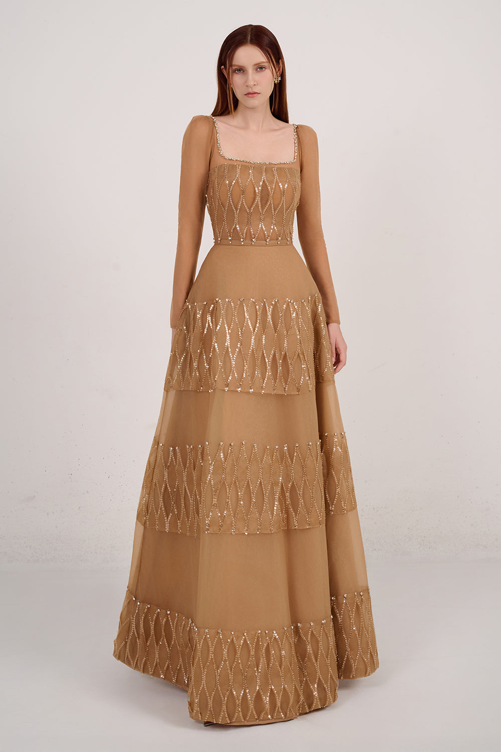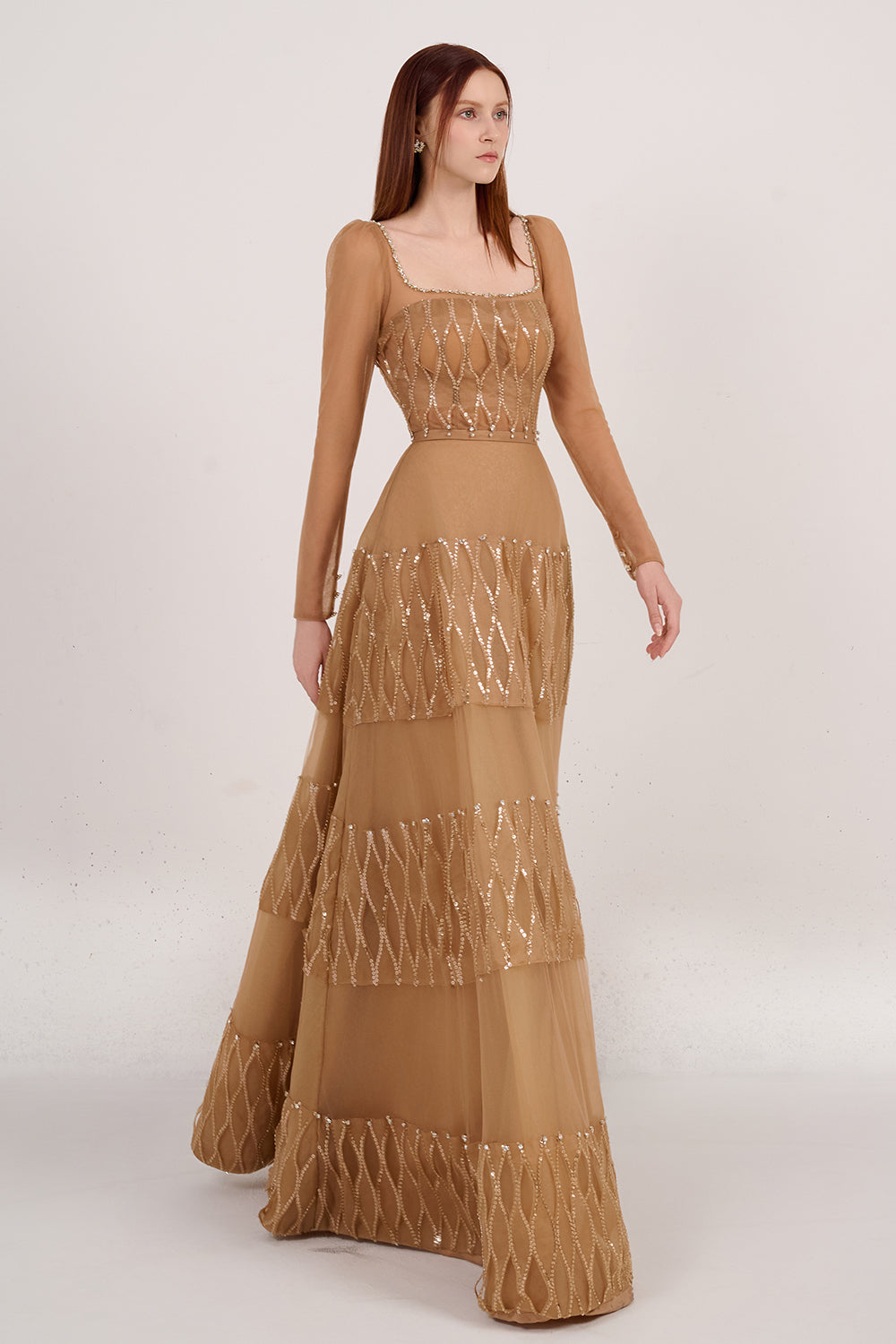 Chic and refined, the dress is a timeless statement of elegance. With its structured square neckline and full-length sleeves, this dress offers a perfect blend of modern minimalism and classic sophistication. The rich brown hue brings warmth and depth, making it an ideal choice for cooler seasons, evening events, or effortless day-to-night styling.