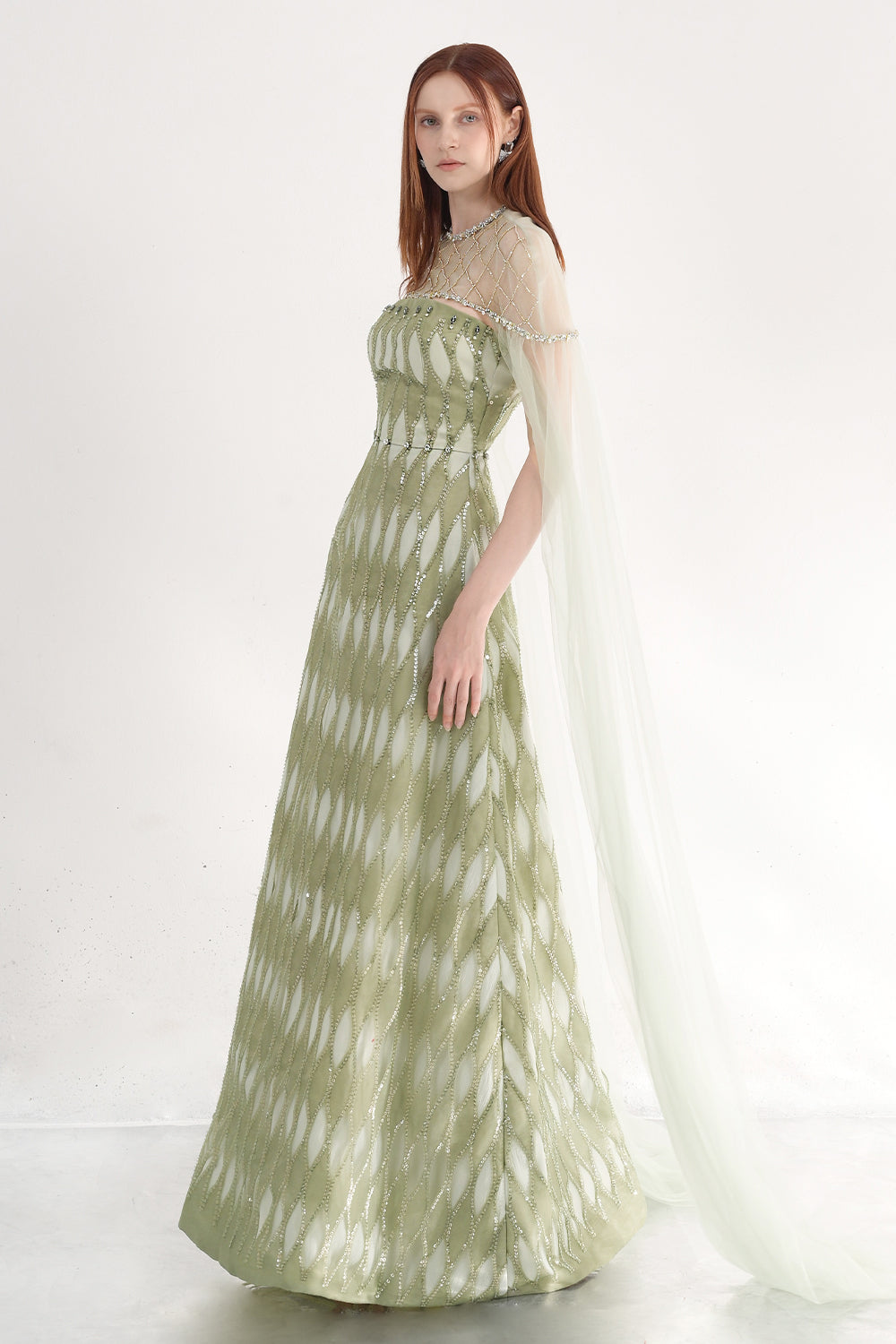 The dress features a refined A-line silhouette complemented by elegant cape-style shoulders. Crafted from high-quality polyester, this dress offers a graceful flow and sophisticated coverage, perfect for formal occasions. The cape shoulder detail adds a dramatic yet polished touch, enhancing the overall silhouette with expert tailoring that ensures both style and comfort. This dress is an excellent choice for those seeking timeless elegance with a contemporary edge.