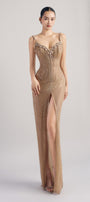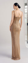 Special Features: High front slit, Corset design with lacing at the back, Attached stones along neckline