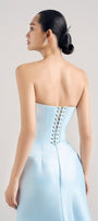 Special Features: Pleated at the waist, Open shoulder, High side slit, Corset lacing at the back, Mermaid back train