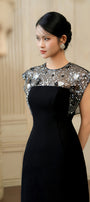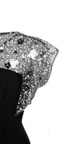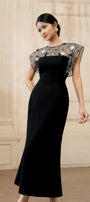 Special Features: Mesh sheer cape shoulder with sequins, Dart lines
