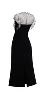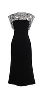 The midi dress expertly combines luxurious velvet with delicate mesh, featuring an embellished sheer overlay on the shoulders. This sophisticated design offers a flattering silhouette with a touch of elegance, perfect for formal occasions where refined style is essential.