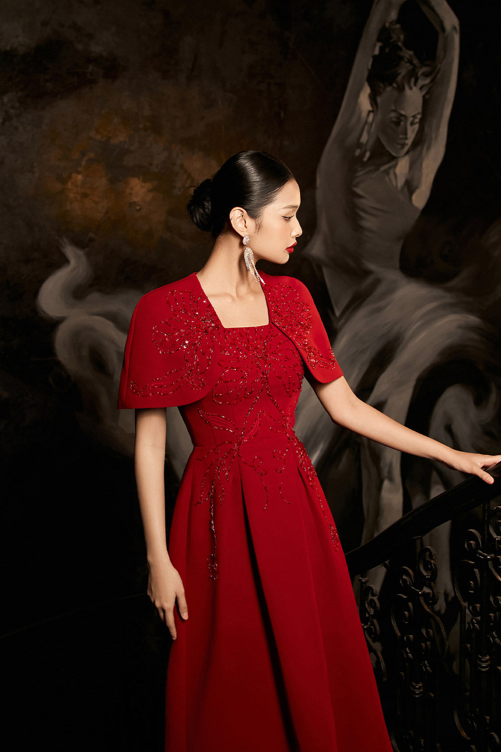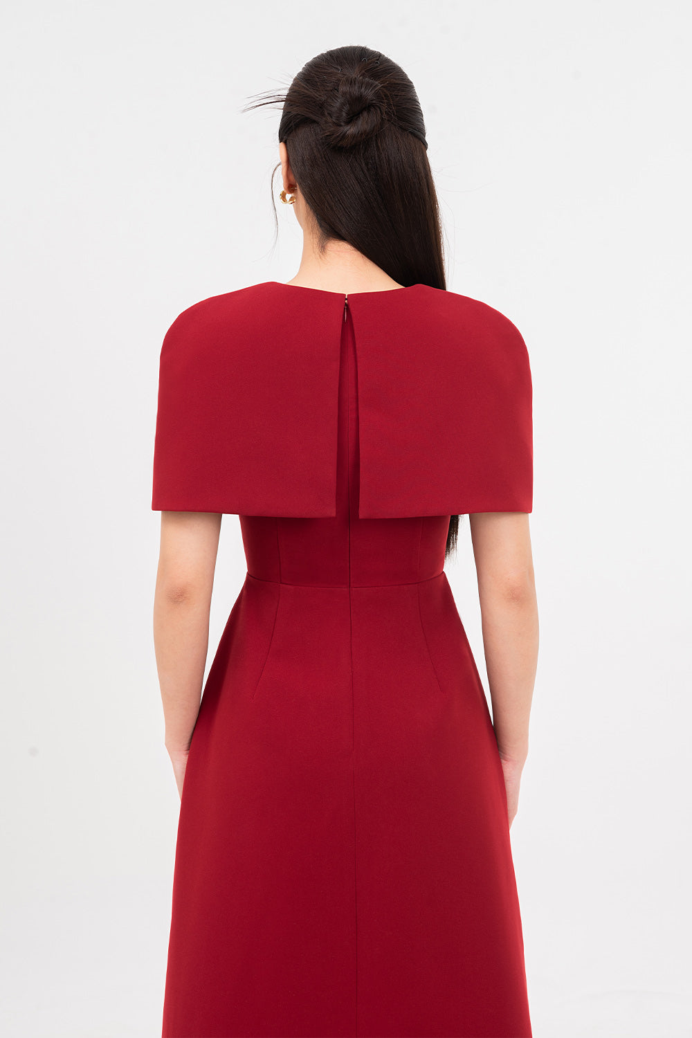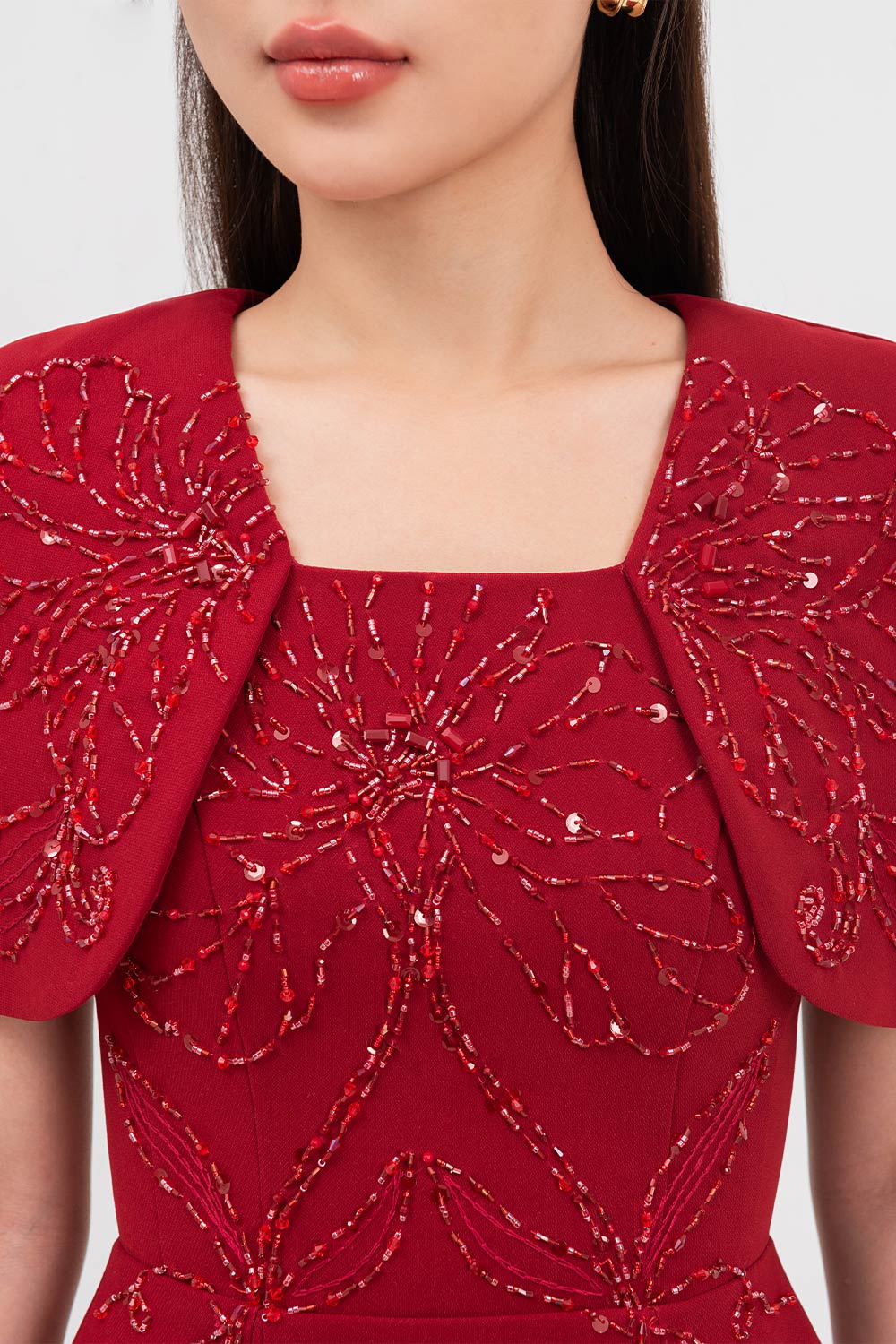 Symmetric beads attached along the dress, Undetachable slit back cape shoulder, Dart line