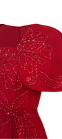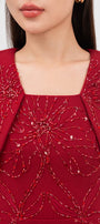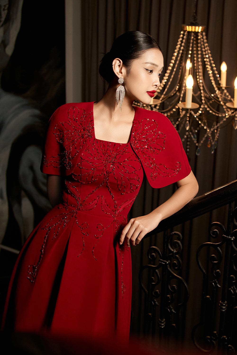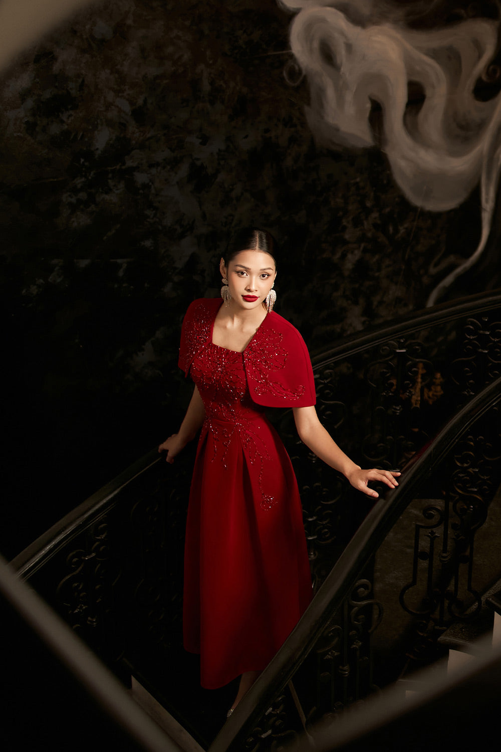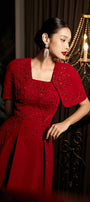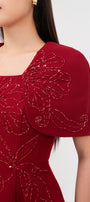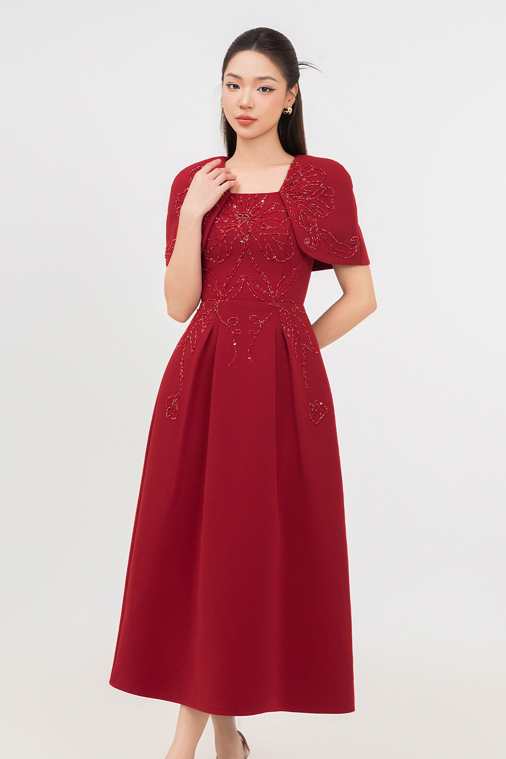 Symmetric beads attached along the dress, Undetachable slit back cape shoulder, Dart line