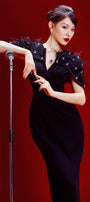 Attached rhinestone and ostrich feathers on cape, Slit back, Keyhole V-cut neck