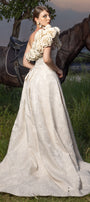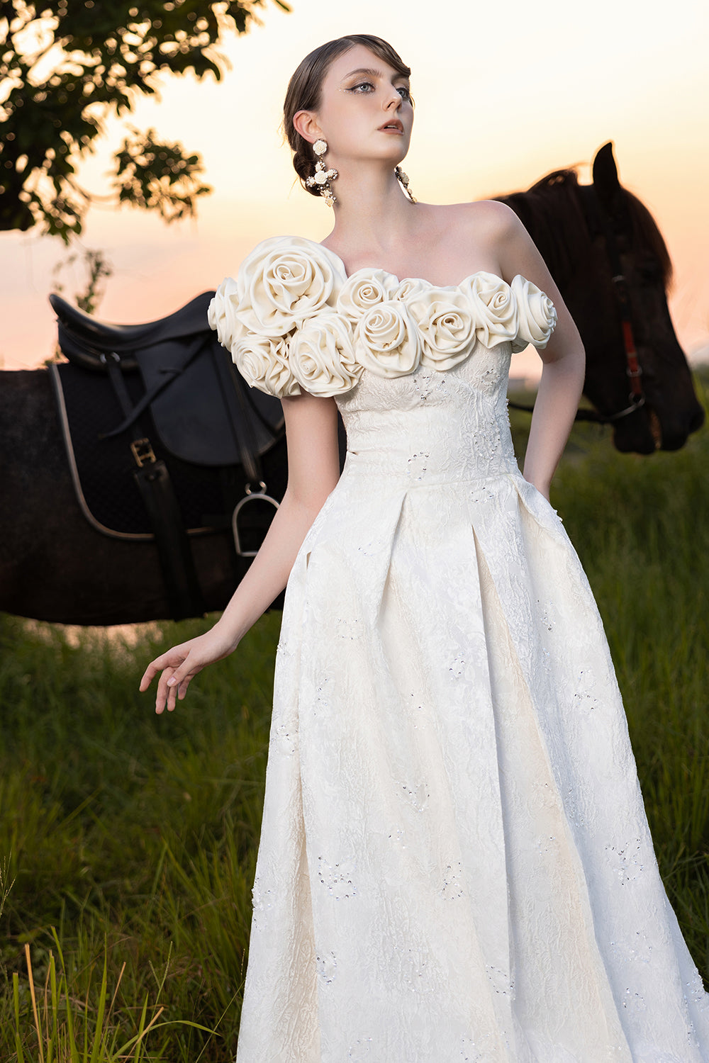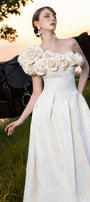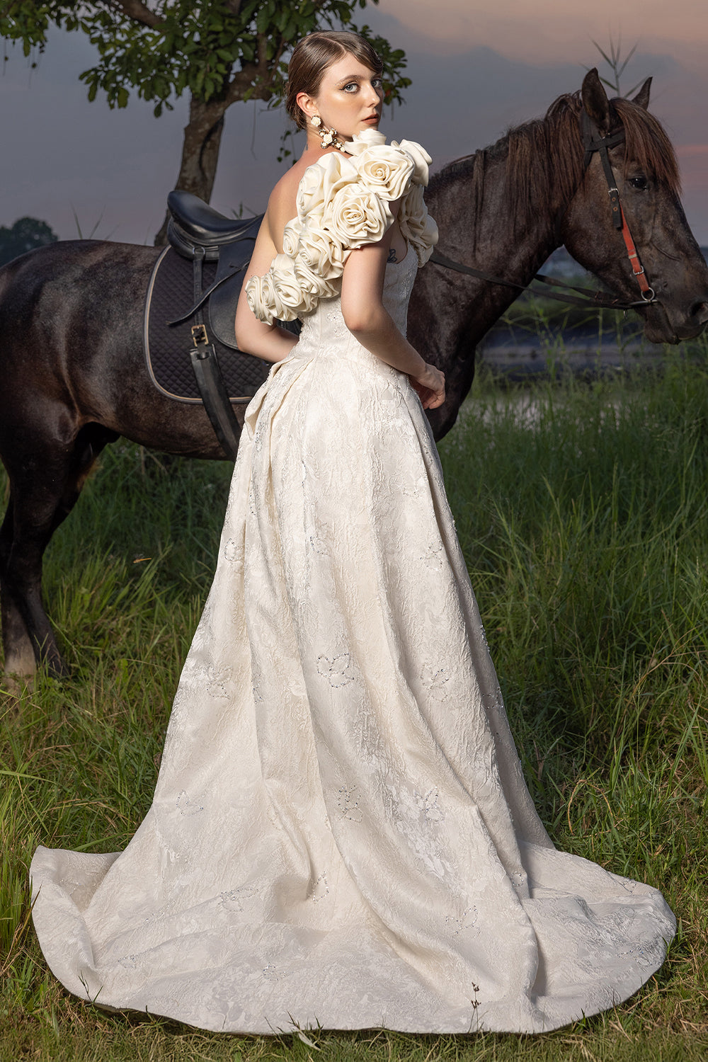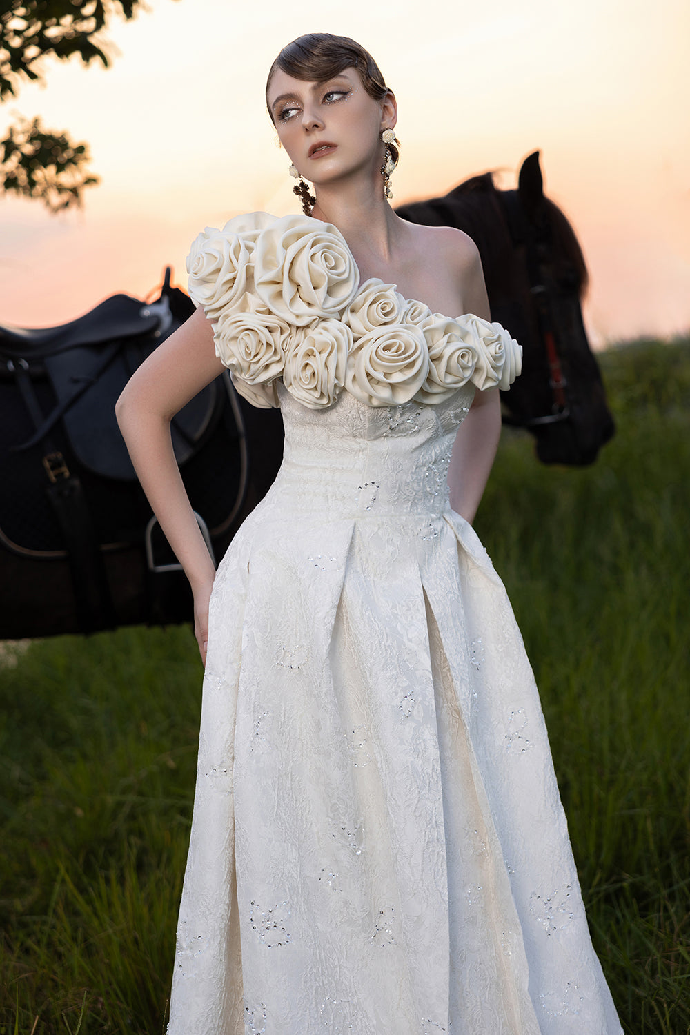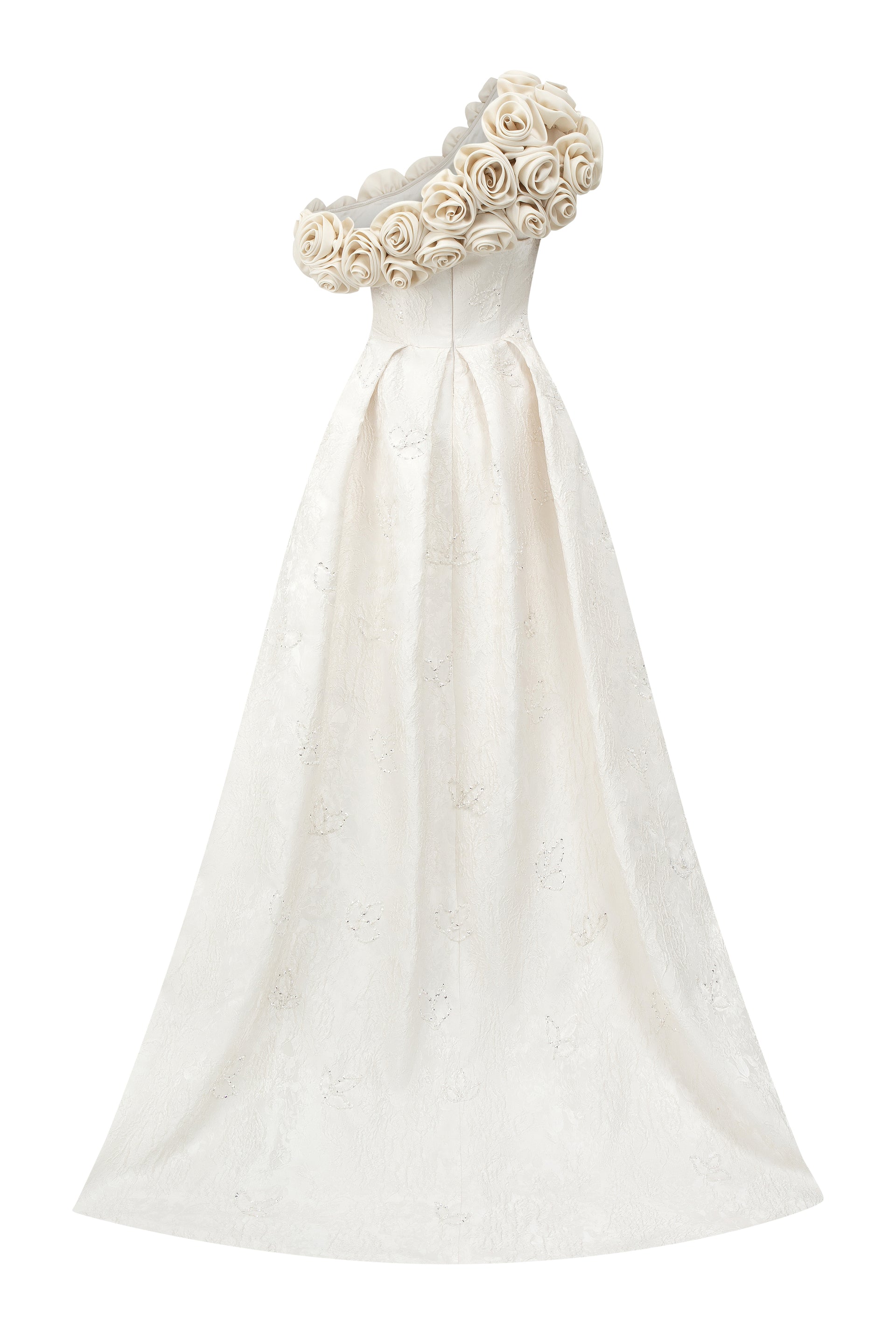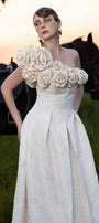 Elevate your style with this expert-designed one-shoulder ball gown maxi dress, crafted from luxe brocade with delicate pleats, glitter, and intricate appliqué. Perfect for black-tie events, galas, and sophisticated evening occasions.