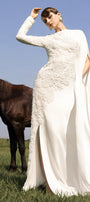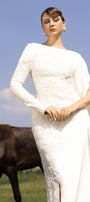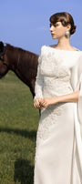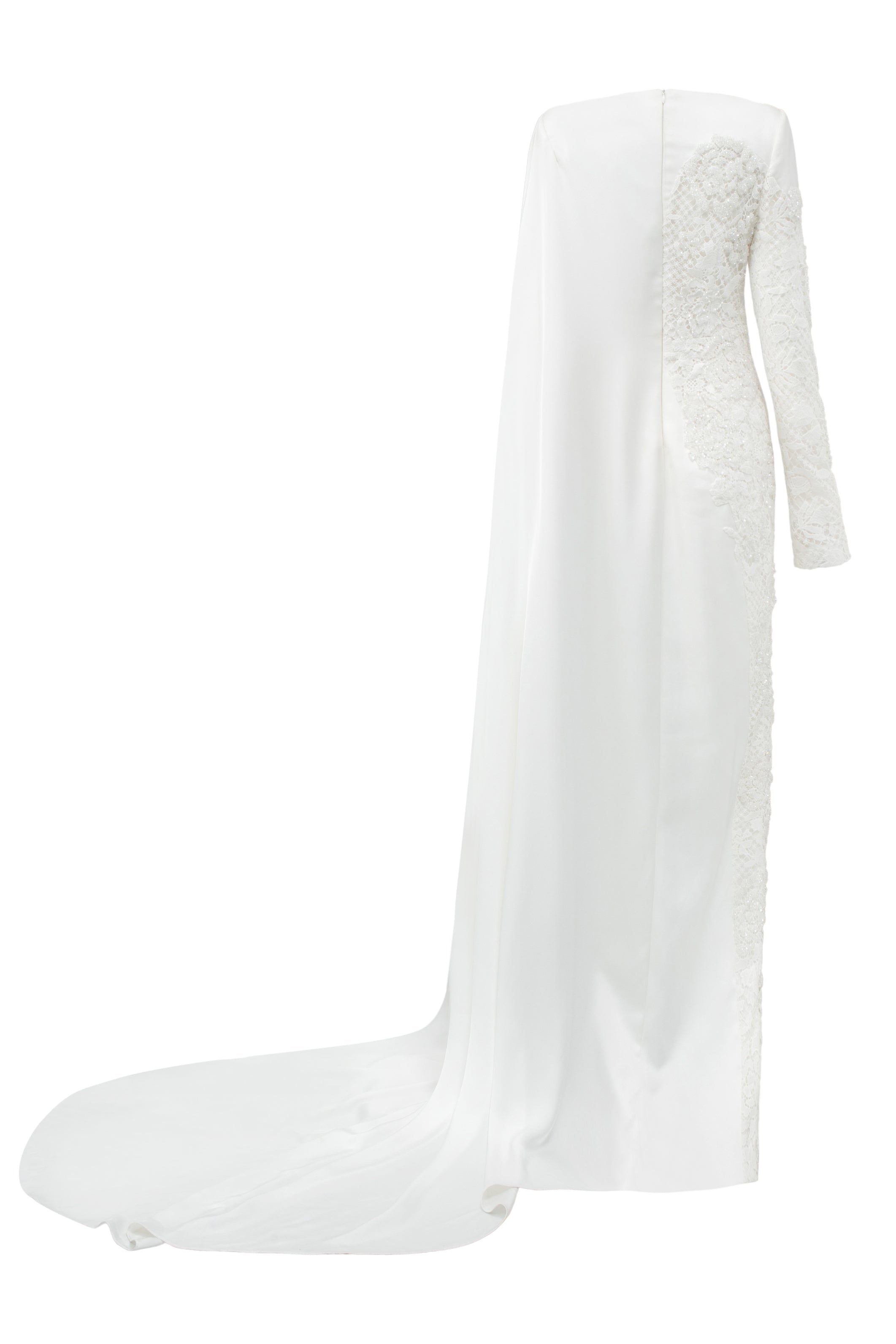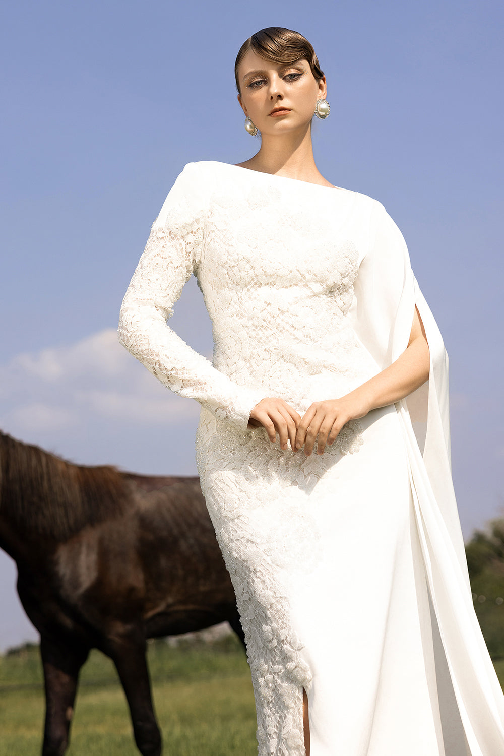 Sophisticated and modern, this silk sheath maxi dress features an elegant boat neck and an eye-catching asymmetric sleeve, adorned with exquisite applique detailing. Ideal for galas, evening events, or upscale gatherings.