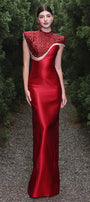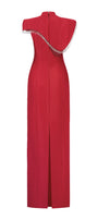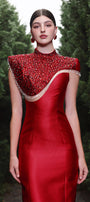 Faux cape design with crystal fringe, Attached rhinestone on the upper dress, Dart line along the dress, Slit back, Back zipper