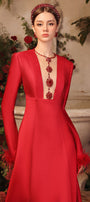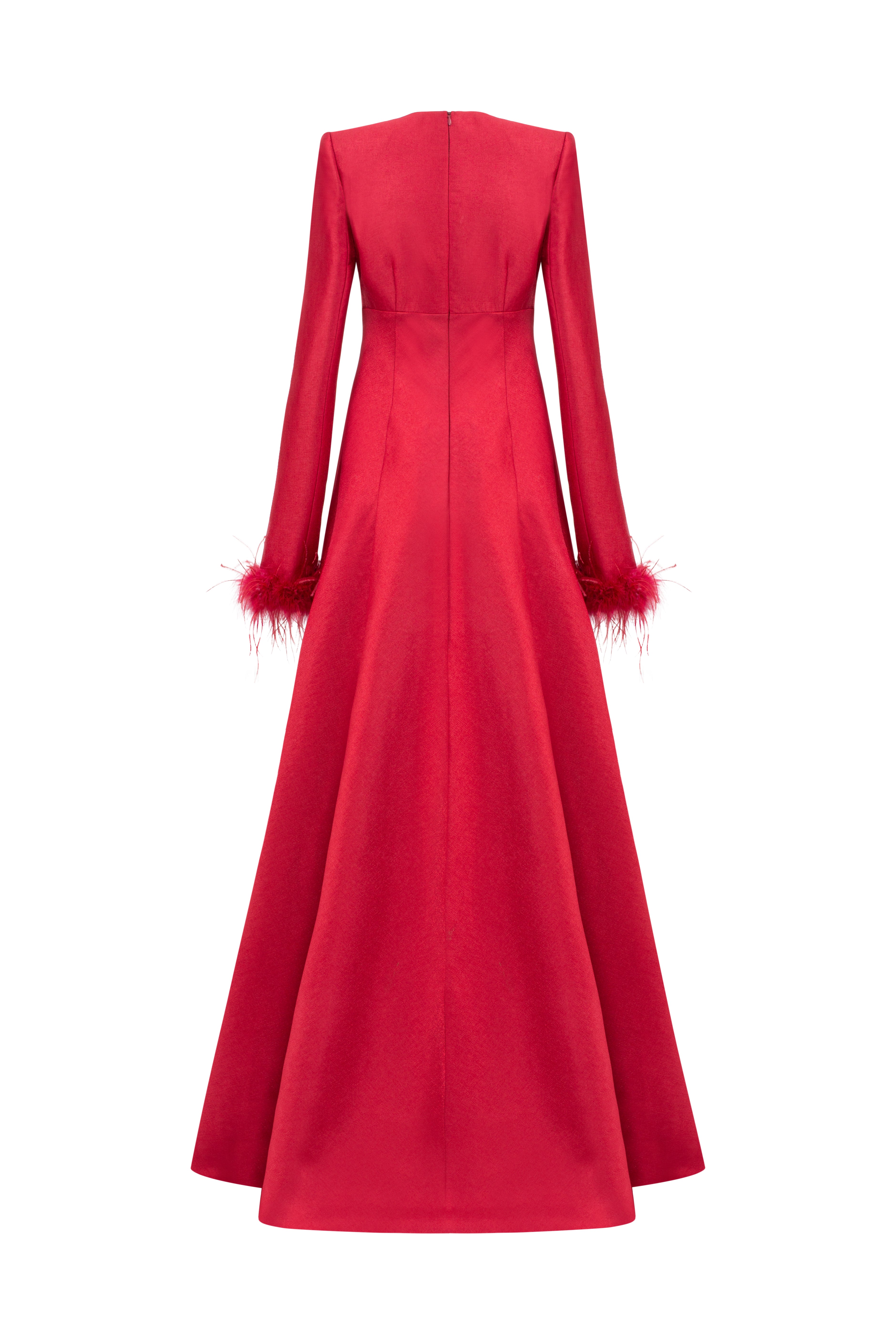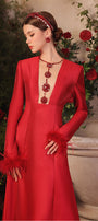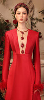 Sheer mesh cut-out neckline with rhinestone, Dart line along the dress, Fringe fur detail at the cuff, Back zipper