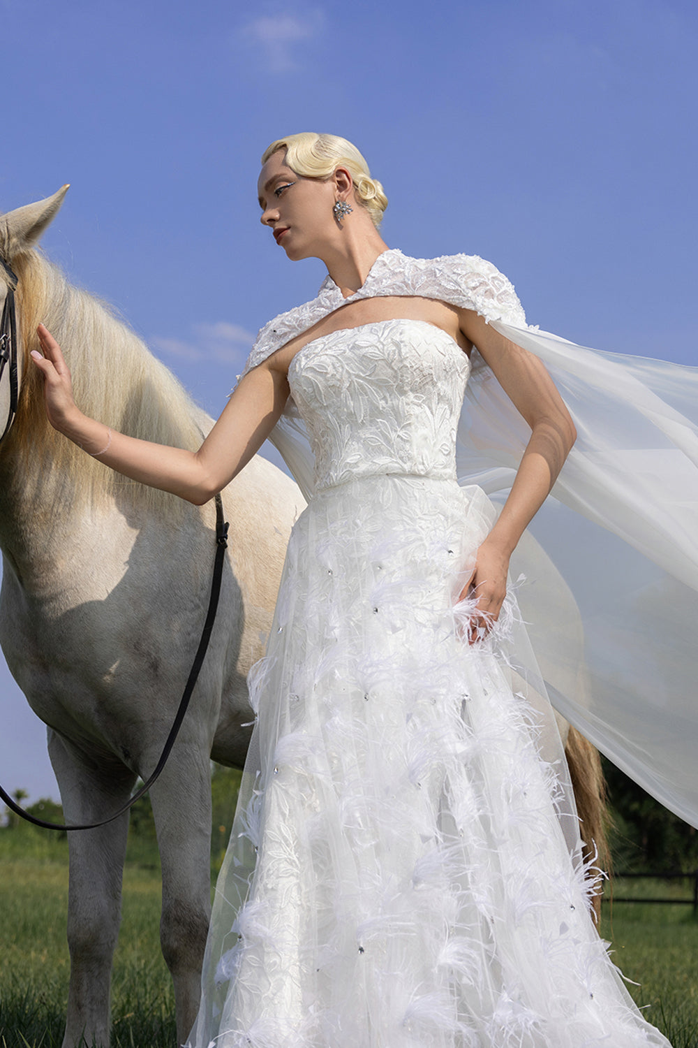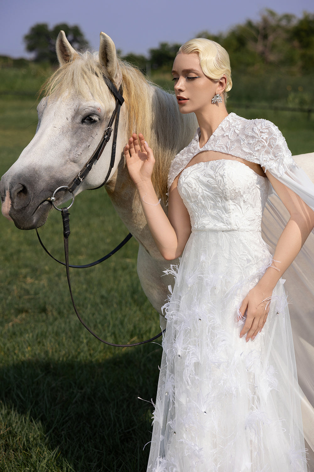 Elevate your wardrobe with this expert-crafted A-line maxi dress, featuring a straight across neckline and exquisite feather embellishments on ethereal tulle. An ideal choice for upscale soirées, galas, or any event where making a sophisticated impression matters.