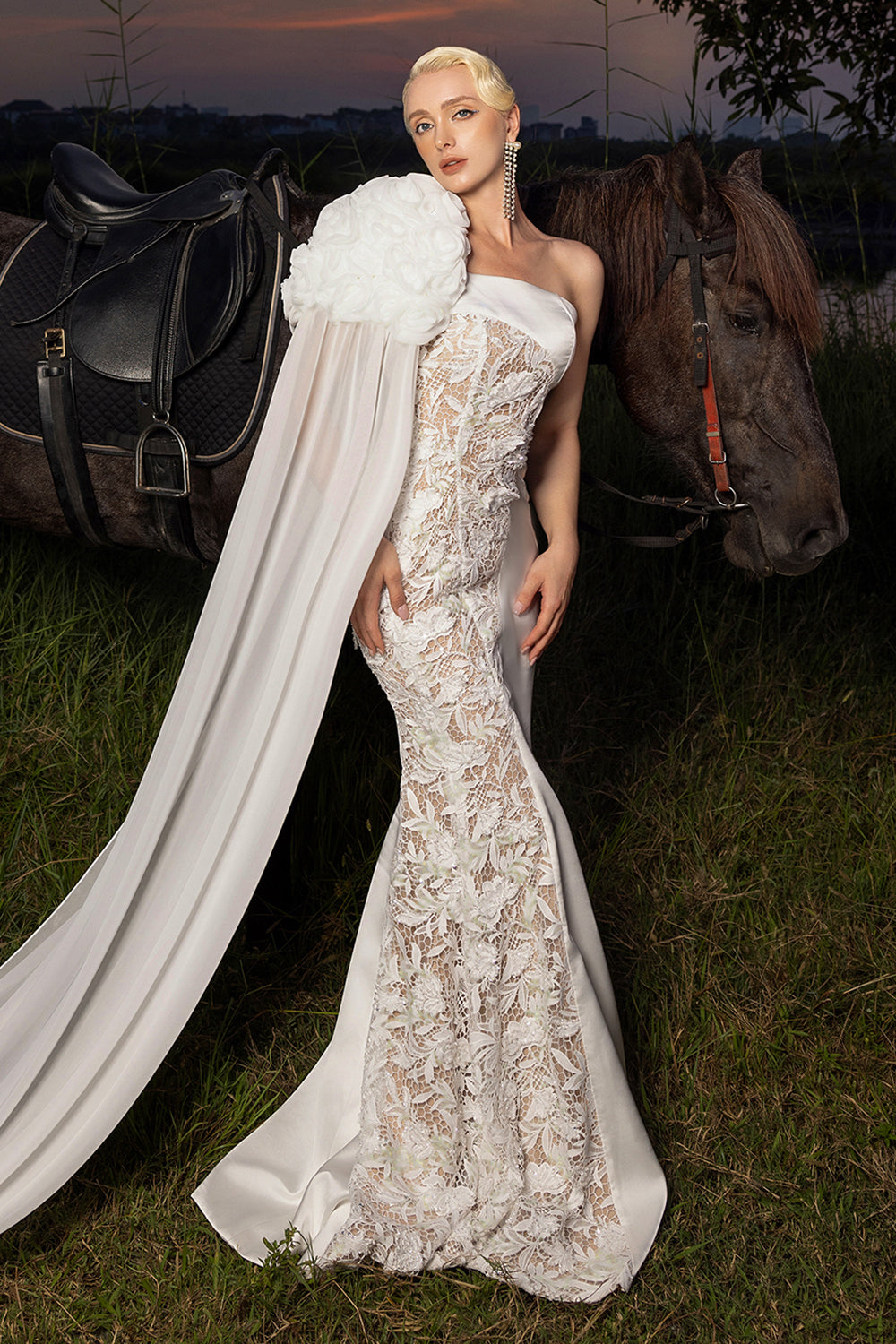 Elevate your style with this expert-crafted silk mermaid maxi dress, featuring a sophisticated one-shoulder neckline and exquisite applique detailing. Ideal for weddings, formal galas, or upscale evening events.