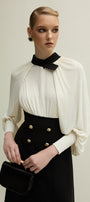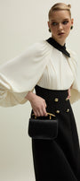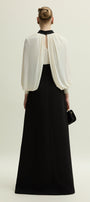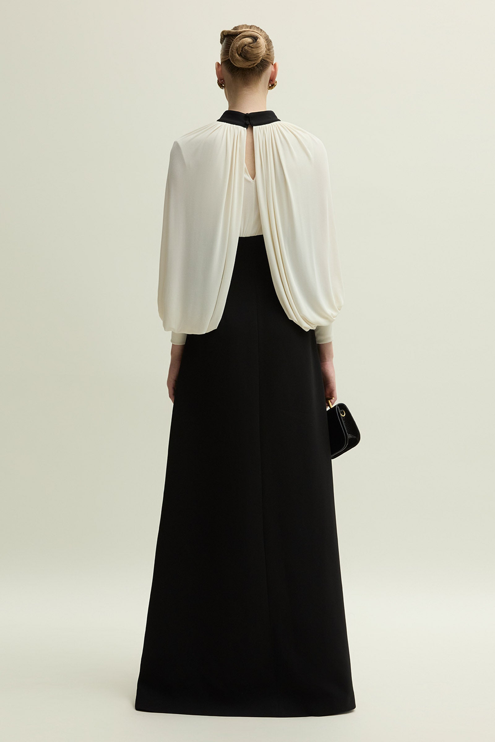 Elevate your style with this expertly tailored A-line maxi dress in elegant crepe. Featuring a high neck, bishop sleeves, gathered seams, and button accents, it offers refined sophistication for formal events, evenings, or special occasions.