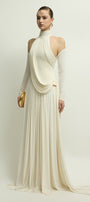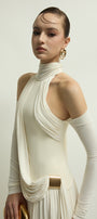 Elevate your style with this expertly crafted sheath maxi dress. Featuring a cotton halter neckline, cold shoulder sleeves, refined draped detailing, and chic metal embellishments, it combines sophistication with a modern edge. Ideal for elegant evening events, upscale gatherings, or formal celebrations.