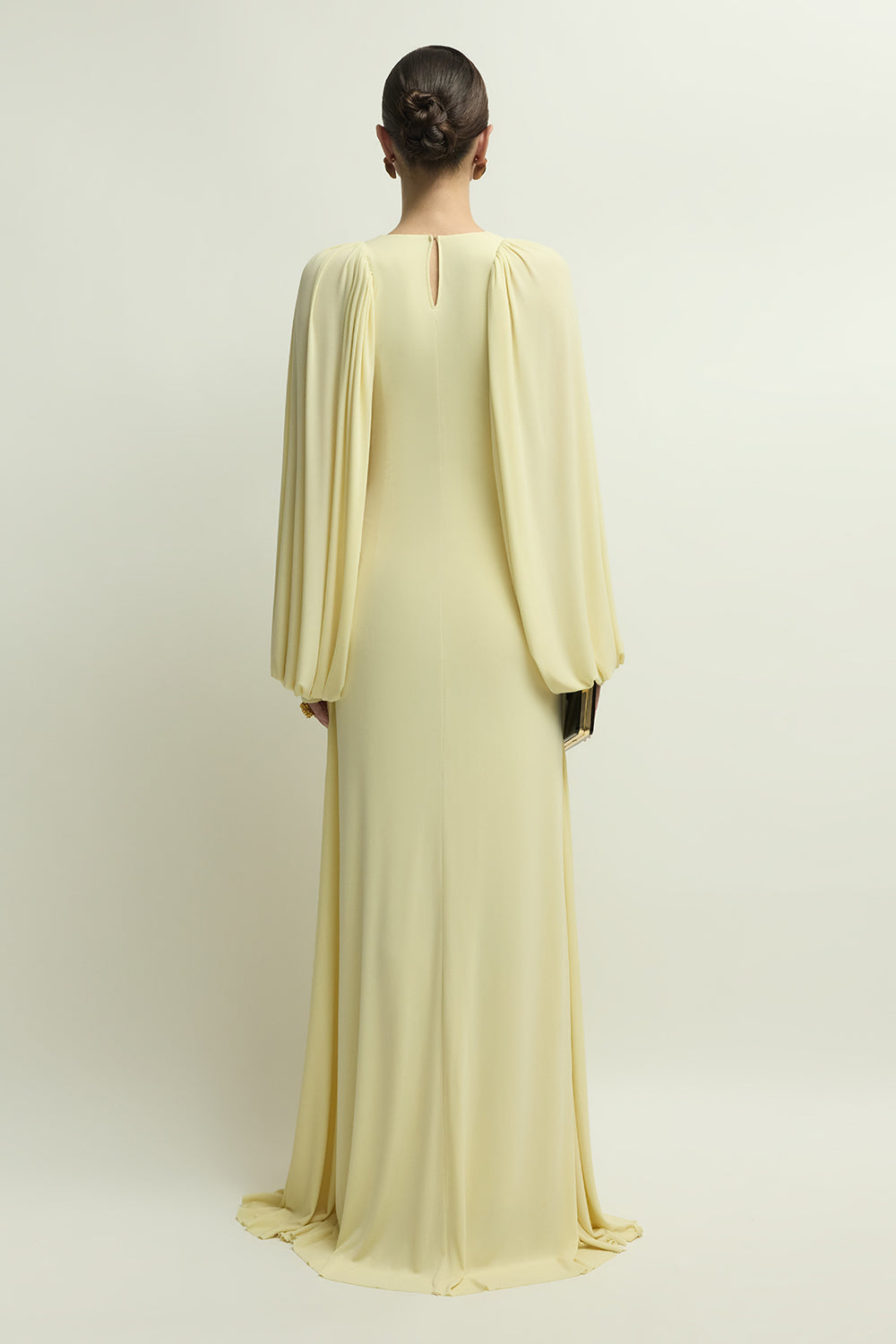 This A-line maxi dress combines graceful bishop sleeves, a refined V-neck, artful gathering, and button embellishments, all crafted from luxurious jersey. It's your expert choice for weddings, sophisticated dinners, or special evening events.